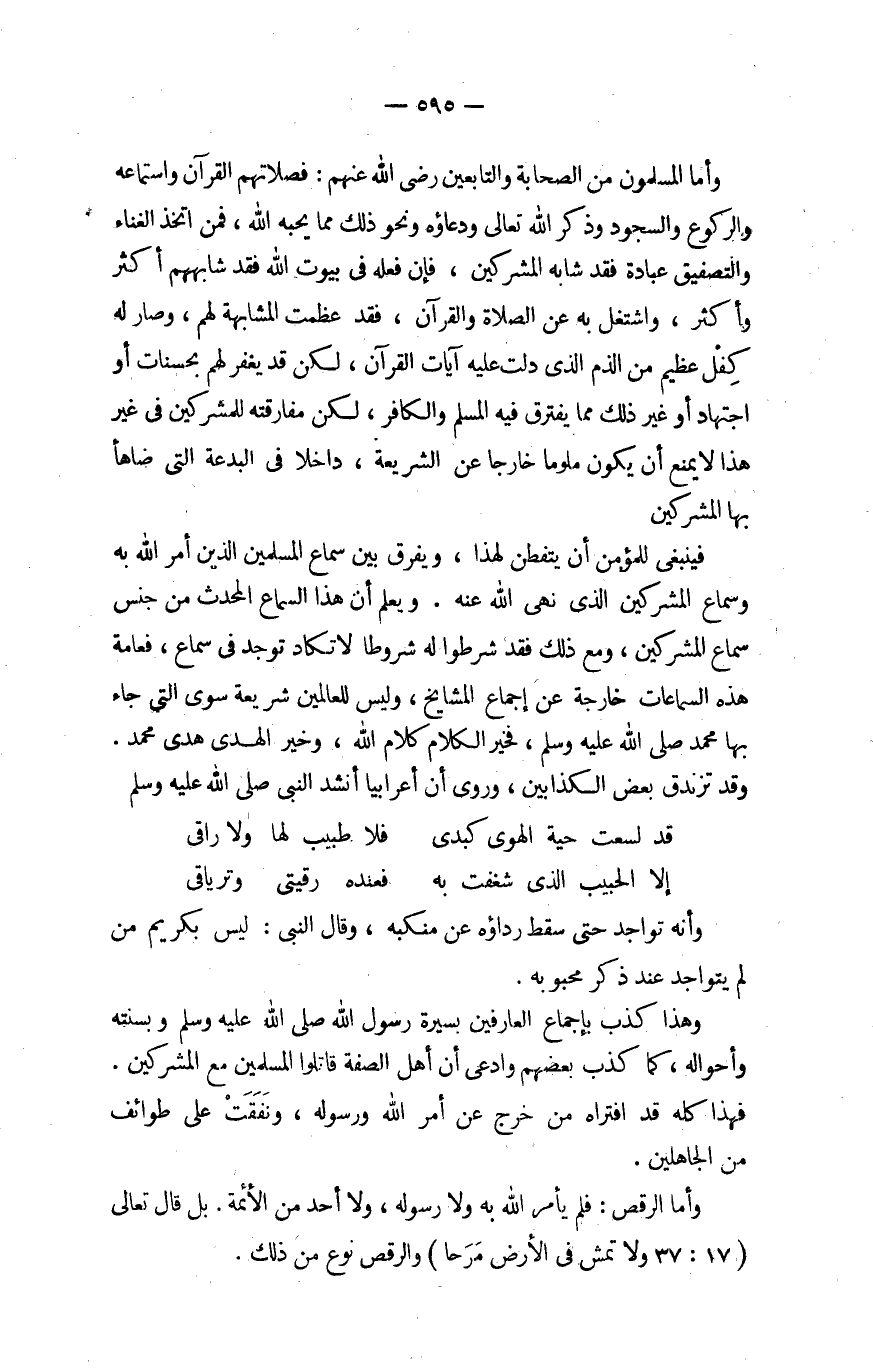 فَيَنْبَغِي لِلْمُؤمنِ أَن يتفطن لهَذَا وَيفرق بَين سَماع الْمُسلمين الَّذين أَمر الله بِهِ وَسَمَاع الْمُشْركين الَّذِي نهى عَنهُ وَيعلم أَن هَذَا السماع الْمُحدث من جنس سَماع الْمُشْركين وَمَعَ ذَلِك فقد شرطُوا لَهُ شُرُوطًا لَا تكَاد تُوجد فِي سَماع فعامة هَذِه السماعات خَارِجَة عَن إِجْمَاع الْمَشَايِخ وَلَيْسَ للْعَالمين شَرِيعَة سوى الَّتِي جَاءَ بهَا مُحَمَّد صلى الله عَلَيْهِ وَسلم فَخير الْكَلَام كَلَام الله وَخير الْهدى هدى مُحَمَّد وَقد تزندق بعض الْكَذَّابين وروى أَنه أَعْرَابِيًا أنْشد النَّبِي صلى الله عَلَيْهِ وَسلم