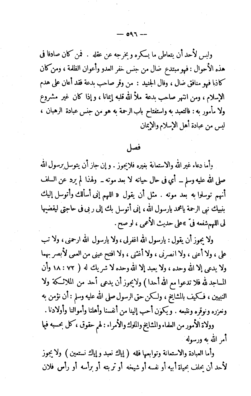 وَلَا يجوز أَن يَقُول يَا رَسُول الله اغْفِر لي وَلَا يَا رَسُول الله ارْحَمْنِي وَلَا تب على وَلَا أَعنِي وَلَا أنصرني وَلَا أَغِثْنِي وَلَا افْتَحْ عَيْني من الْعَمى لَأبْصر بهما وَلَا يدعى إِلَّا الله وَحده وَلَا يعبد إِلَّا الله وَحده لَا شريك لَهُ {وَأَن الْمَسَاجِد لله فَلَا تدعوا مَعَ الله أحدا} وَلَا يجوز أَن يدعى أحد من الْمَلَائِكَة وَلَا النَّبِيين فَكيف بالمشايخ وَلَكِن حق الرَّسُول صلى الله عَلَيْهِ وَسلم أَن نؤمن بِهِ ونعزره ونوقره ونتبعه وَيكون أحب إِلَيْنَا من أَنْفُسنَا وأهلنا وَأَمْوَالنَا وَأَوْلَادنَا
