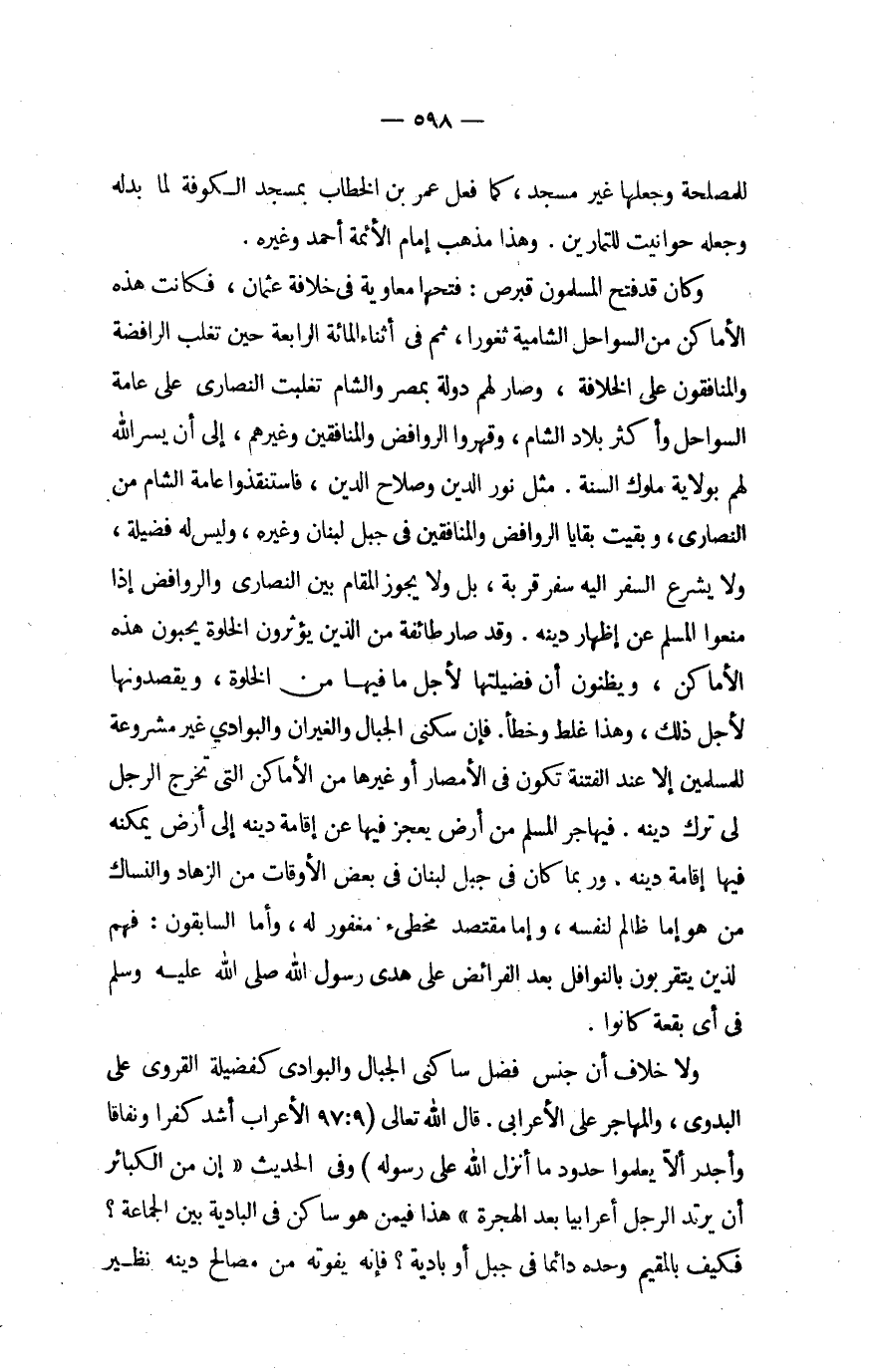 وَكَانَ قد فتح الْمُسلمُونَ قبرص فتحهَا مُعَاوِيَة فِي خلَافَة عُثْمَان فَكَانَت هَذِه الْأَمَاكِن من السواحل الشامية ثغورا ثمَّ فِي أثْنَاء الْمِائَة الرَّابِعَة حِين تغلب الرافضة والمنافقون على الْخلَافَة وَصَارَ لَهُم دولة بِمصْر وَالشَّام تغلبت النَّصَارَى على عَامَّة السواحل وَأكْثر بِلَاد الشَّام وقهروا الروافض وَالْمُنَافِقِينَ وَغَيرهم إِلَى أَن يسر الله لَهُم بِولَايَة مُلُوك السّنة مثل نور الدّين وَصَلَاح الدّين فاستنفذوا عَامَّة الشَّام من النَّصَارَى وَبقيت بقايا الروافض وَالْمُنَافِقِينَ فِي جبل لبنان وَغَيره وَلَيْسَ لَهُ فَضِيلَة وَلَا يشرع السّفر اليه سفر قربَة بل وَلَا يجوز الْمقَام بَين النَّصَارَى وَالرَّوَافِض إِذا منعُوا الْمُسلم عَن إِظْهَار دينه وَقد صَار طَائِفَة من الَّذين يؤثرون الْخلْوَة يحبونَ هَذِه الْأَمَاكِن ويظنون أَن فضيلتها لأجل مَا فِيهَا من الْخلْوَة ويقصدونها لأجل ذَلِك وَهَذَا غلط وَخطأ فَإِن سُكْنى الْجبَال والغيران والبوادي غير مَشْرُوطَة للْمُسلمين إِلَّا عِنْد الْفِتْنَة تكون فِي الْأَمْصَار أَو غَيرهَا من الْأَمَاكِن الَّتِي تخرج الرجل لي ترك دينه فيهاجر الْمُسلم من أَرض يعجز فِيهَا عَن إِقَامَة دينه إِلَى أَرض يُمكنهُ فِيهَا إِقَامَة دينه وَرُبمَا كَانَ فِي جبل لبنان فِي بعض الْأَوْقَات من الزهاد والنساك من هُوَ إِمَّا ظَالِم لنَفسِهِ وَإِمَّا مقتصد مخطىء مغْفُور لَهُ وَأما السَّابِقُونَ فهم لذين يَتَقَرَّبُون بالنوافل بعد الْفَرَائِض على هدى رَسُول الله صلى الله عَلَيْهِ وَسلم فِي أَي بقْعَة كَانُوا