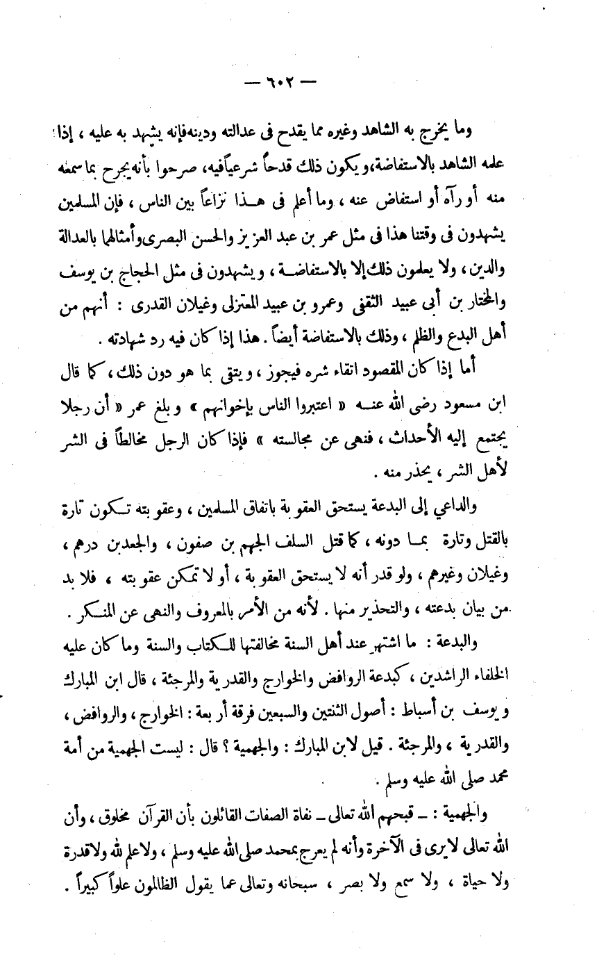 والبدعة مَا اشْتهر عِنْد أهل السّنة مخالفتها للْكتاب وَالسّنة وَمَا كَانَ عَلَيْهِ الْخُلَفَاء الرَّاشِدين كبدعة الروافض والخوارج والقدرية والمرجئة قَالَ ابْن الْمُبَارك ويوسف بن أَسْبَاط أصُول الثِّنْتَيْنِ وَالسبْعين فرقة أَرْبَعَة الْخَوَارِج وَالرَّوَافِض والقدرية والمرجئة قيل لِابْنِ الْمُبَارك والجهمية قَالَ لَيست الْجَهْمِية من أمة مُحَمَّد صلى الله عَلَيْهِ وَسلم