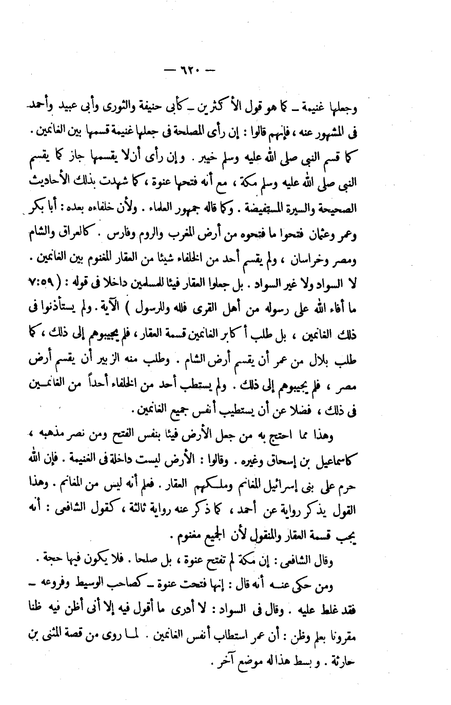 وَجعلهَا غنيمَة كَمَا هُوَ قَول الْأَكْثَرين كَأبي حنيفَة وَالثَّوْري وَأبي عبيد وَأحمد فِي الْمَشْهُور عَنهُ فَإِنَّهُم قَالُوا إِن رأى الْمصلحَة فِي جعلهَا غنيمَة قسمهَا بَين الْغَانِمين كَمَا قسما لنَبِيّ صلى الله عَلَيْهِ وَسلم خَيْبَر وَإِن رأى أَن لَا يقسمها جَازَ كَمَا يقسم النَّبِي صلى الله عَلَيْهِ وَسلم مَكَّة مَعَ أَنه فتحهَا عنْوَة كَمَا شهِدت بذلك الْأَحَادِيث الصَّحِيحَة والسيرة المستفيضة وكما قَالَه جُمْهُور الْعلمَاء وَلِأَن خلفاؤه بعده أَبَا بكر وَعَمْرو وَعُثْمَان فتحُوا مَا فتحوه من أَرض الْمغرب وَالروم وَفَارِس كالعراق وَالشَّام ومصر وخراسان وَلم يقسم أحد من الْخُلَفَاء شَيْئا من الْعقار المغنوم بَين الْغَانِمين لَا السوَاد وَلَا غير اسلواد بل جعلُوا الْعقار فَيْئا للْمُسلمين دَاخِلا فِي قَوْله {مَا أَفَاء الله على رَسُوله من أهل الْقرى فَللَّه وَلِلرَّسُولِ} الْآيَة وَلم يستأذونوا فِي ذَلِك الْغَانِمين بل طلب أكَابِر الْغَانِمين قسْمَة الْعقار فَلم يجيبوهم إِلَى ذَلِك كَمَا طلب بِلَال من عمر أَن يقسم أَرض الشَّام وَطلب مِنْهُ الزبير أَن يقسم أَرض مصر فَلم يجيبوهم إِلَى ذَلِك وَلم يستطب أحد من الْخُلَفَاء أحدا من الْغَانِمين فِي ذَلِك فضلا عَن أَن يَسْتَطِيب أنفس جَمِيع الْغَانِمين