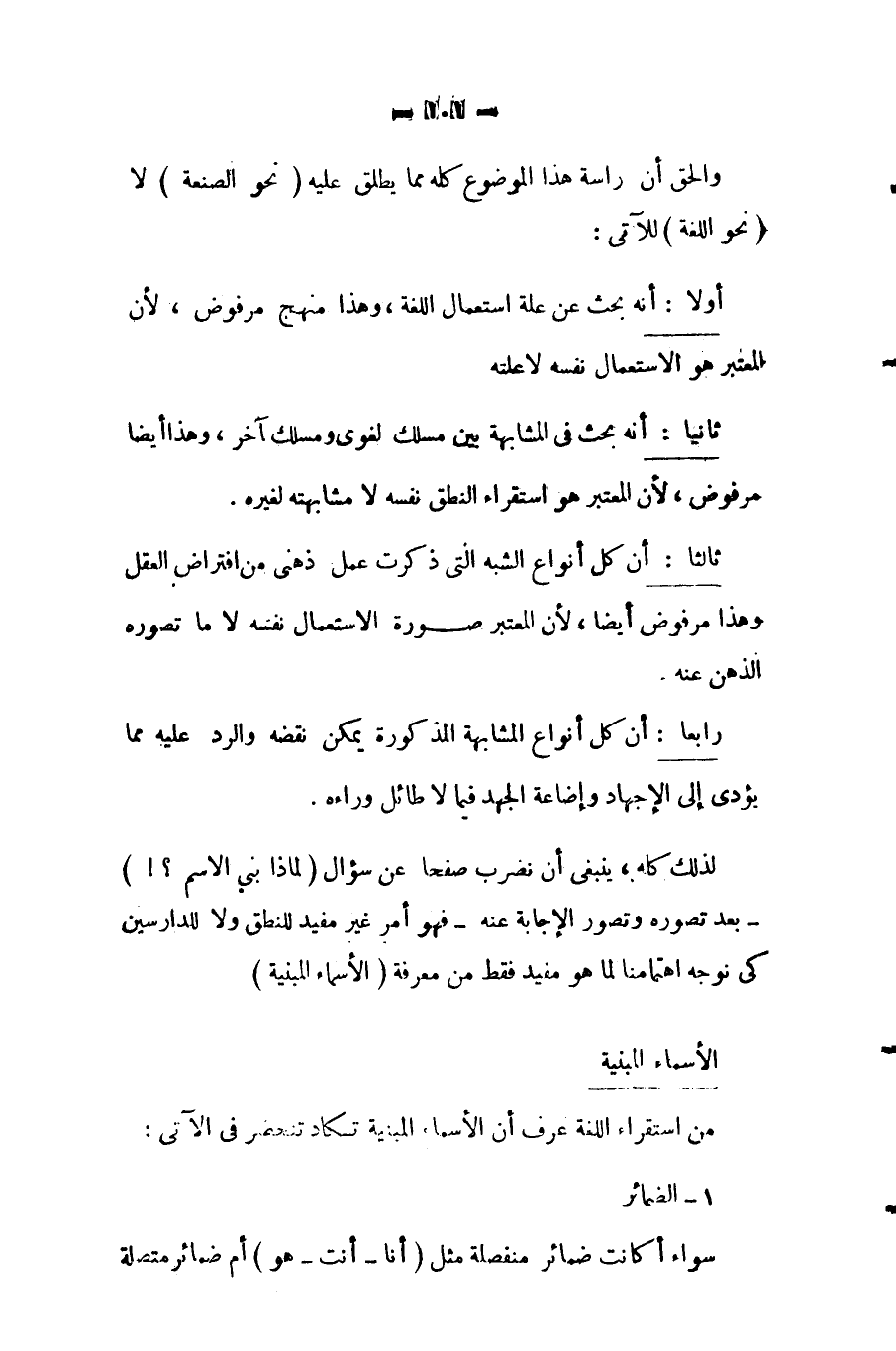 أولا: أنه بحث عن علة استعمال اللغة، وهذا منهج مرفوض، لأن المعتبر هو الاستعمال نفسه لا علته.