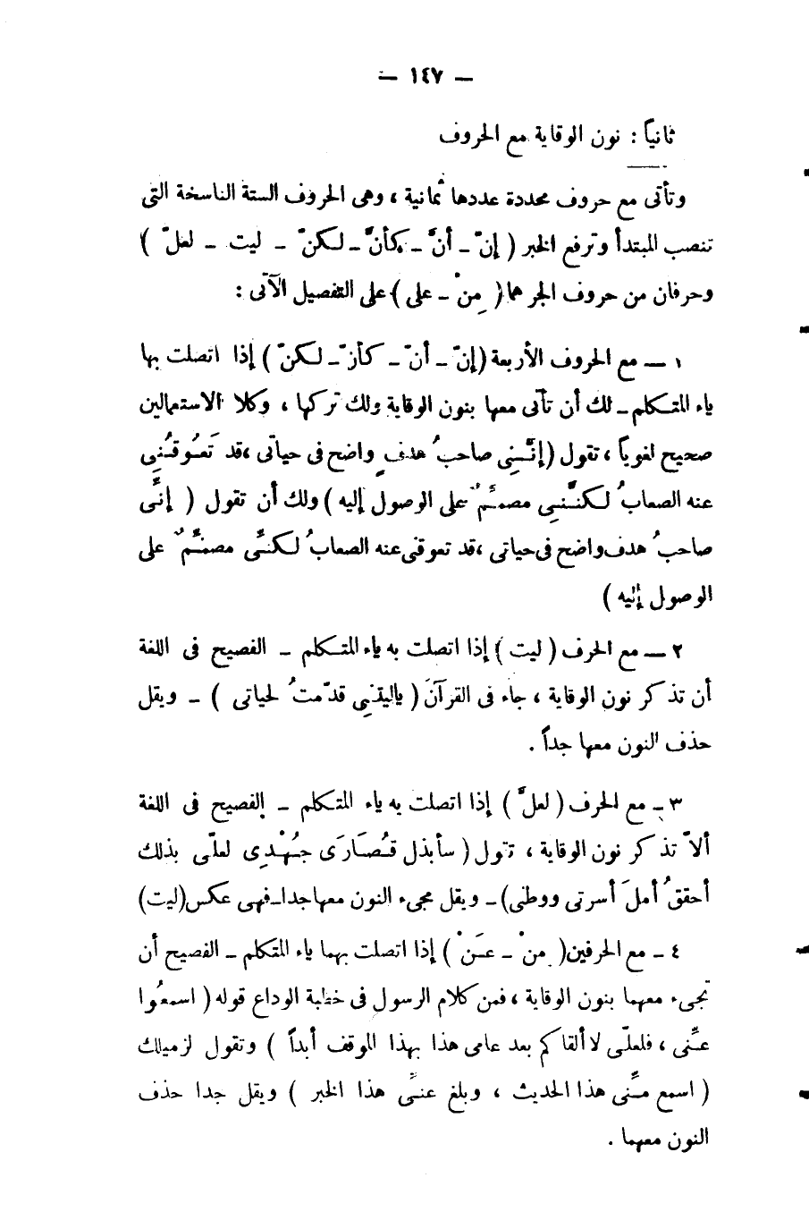 ٢- مع الحرف "ليت" إذا اتصلت به ياء المتكلم، الفصيح في اللغة أن تذكر نون الوقاية، جاء في القرآن: {يَا لَيْتَنِي قَدَّمْتُ لِحَيَاتِي} ، ويقل حذف النون معها جدًّا.