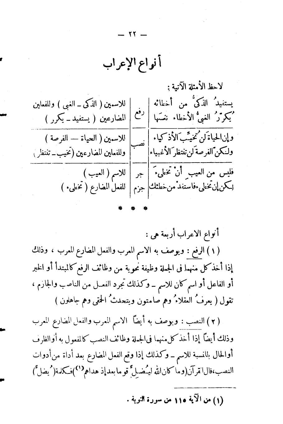 ٢- النصب: ويوصف به أيضا الاسم المعرب والفعل المضارع المعرب وذلك أيضا إذا أخذ كل منهما في الجملة وظائف النصب كالمفعول به أو الظرف أو الحال بالنسبة للاسم، وكذلك إذا وقع الفعل المضارع بعد أداة من أدوات النصب، قال القرآن: {وَمَا كَانَ اللَّهُ لِيُضِلَّ قَوْماً بَعْدَ إِذْ هَدَاهُمْ} ١ فكلمة "يُضلُّ"