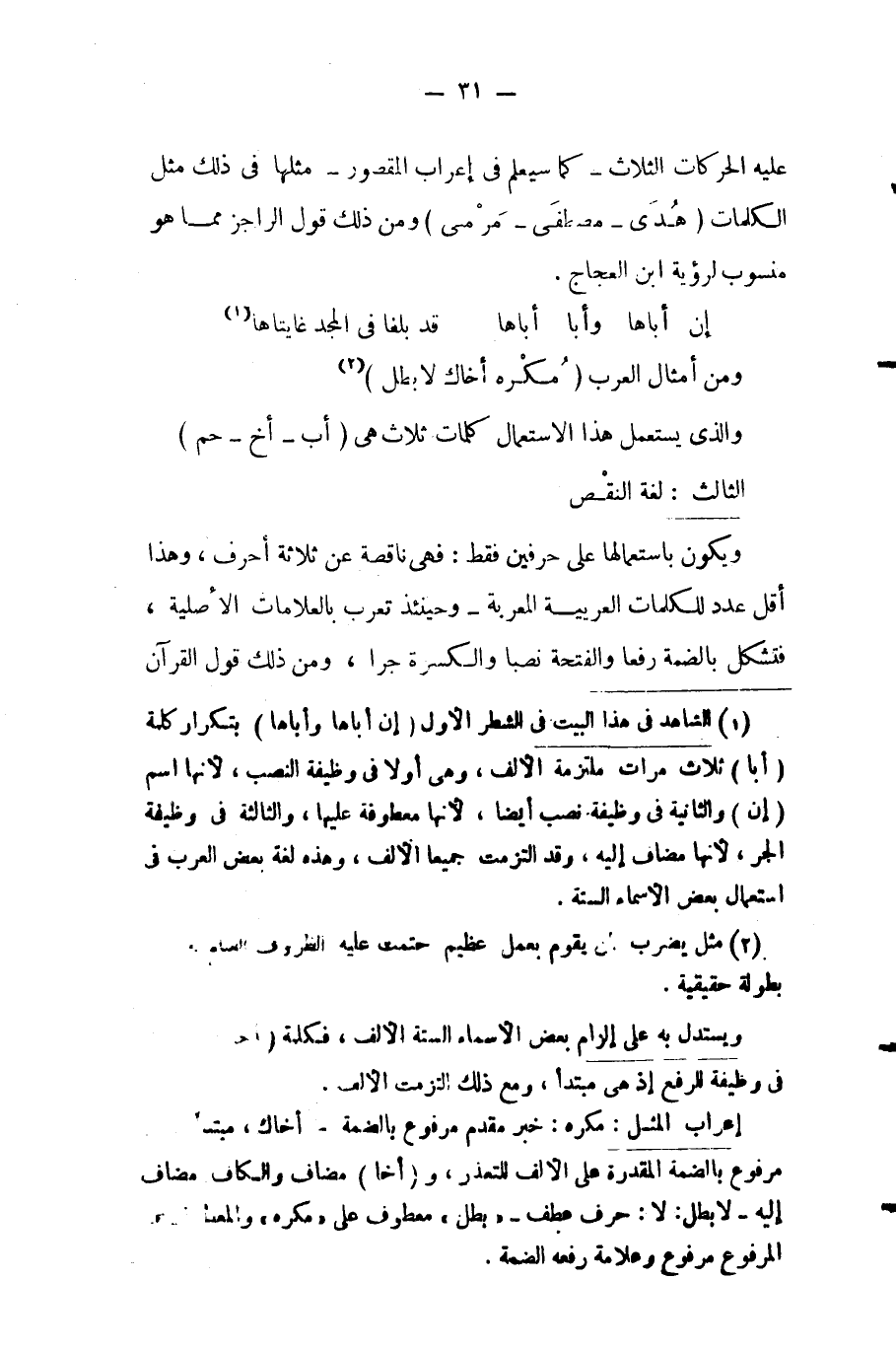 ١ الشاهد في هذا البيت في الشطر الأول "إن أباها وأبا أباها" بتكرار كلمة "أبا" ثلاث مرات ملتزمة الألف، وهي أولا في وظيفة النصب، لأنها اسم "إن" والثانية في وظيفة نصب أيضا، لأنها معطوفة عليها، والثالثة في وظيفة الجر، لأنها مضاف إليه، وقد التزمت جميعا الألف، وهذه لغة بعض العرب في استعمال بعض الأسماء الستة.