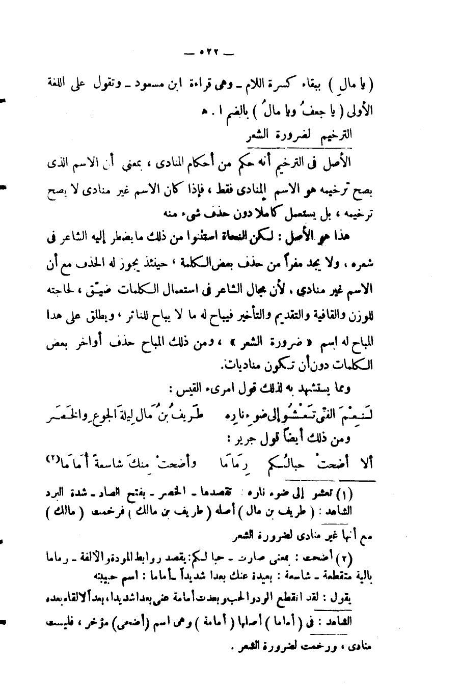 الشاهد: "طريف بن مال" أصله "طريف بن مالك" فرخمت "مالك" مع أنها غير منادى لضرورة الشعر.