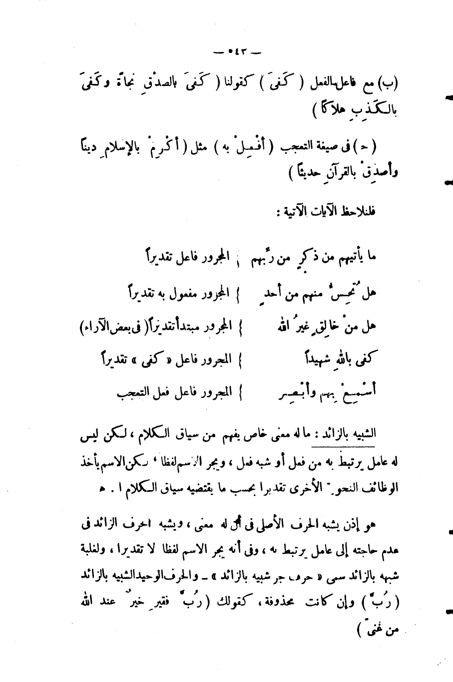 الشبيه بالزائد: ما له معنى خاص يفهم من سياق الكلام، لكن ليس له عامل يرتبط به من فعل أو شبه فعل، ويجر الاسم لفظا، لكن الاسم يأخذ الوظائف النحوية الأخرى تقديرا بحسب ما يقتضيه سياق الكلام ا. هـ.