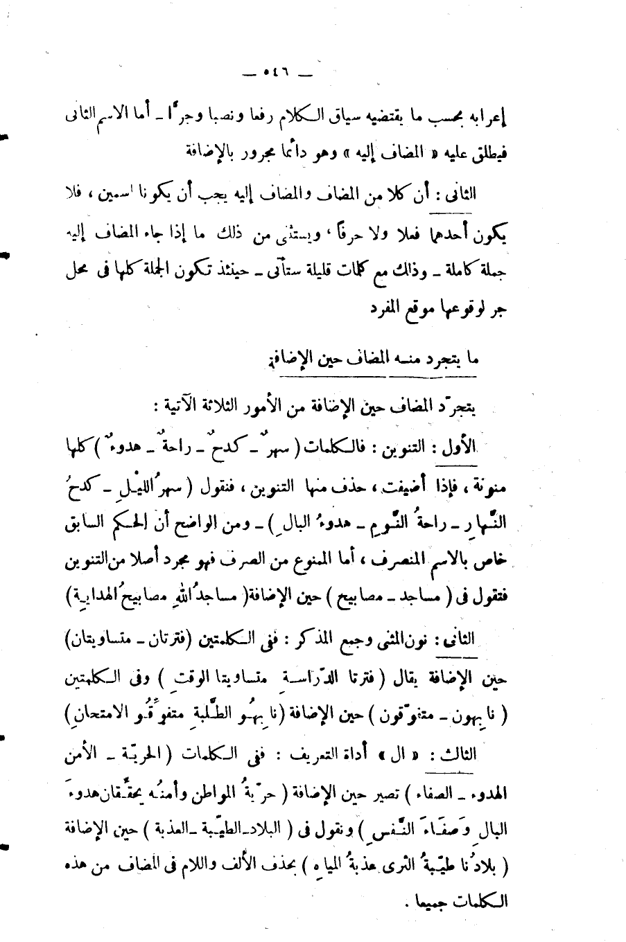 الثالث: "أل" أداة التعريف: ففي الكلمات: "الحريّة، الأمن، الهدوء، الصفاء" تصير حين الإضافة "حرّية المواطنِ وأمنُه يحقِّقان هدوءَ البالِ وصفاءَ النَّفسِ" ونقول في "البلاد، الطيّبة، العذبة" حين الإضافة: "بلادُنا طيّبةُ الثرى عذبةُ المياهِ" بحذف الألف واللام في المضاف من هذه الكلمات جميعا.