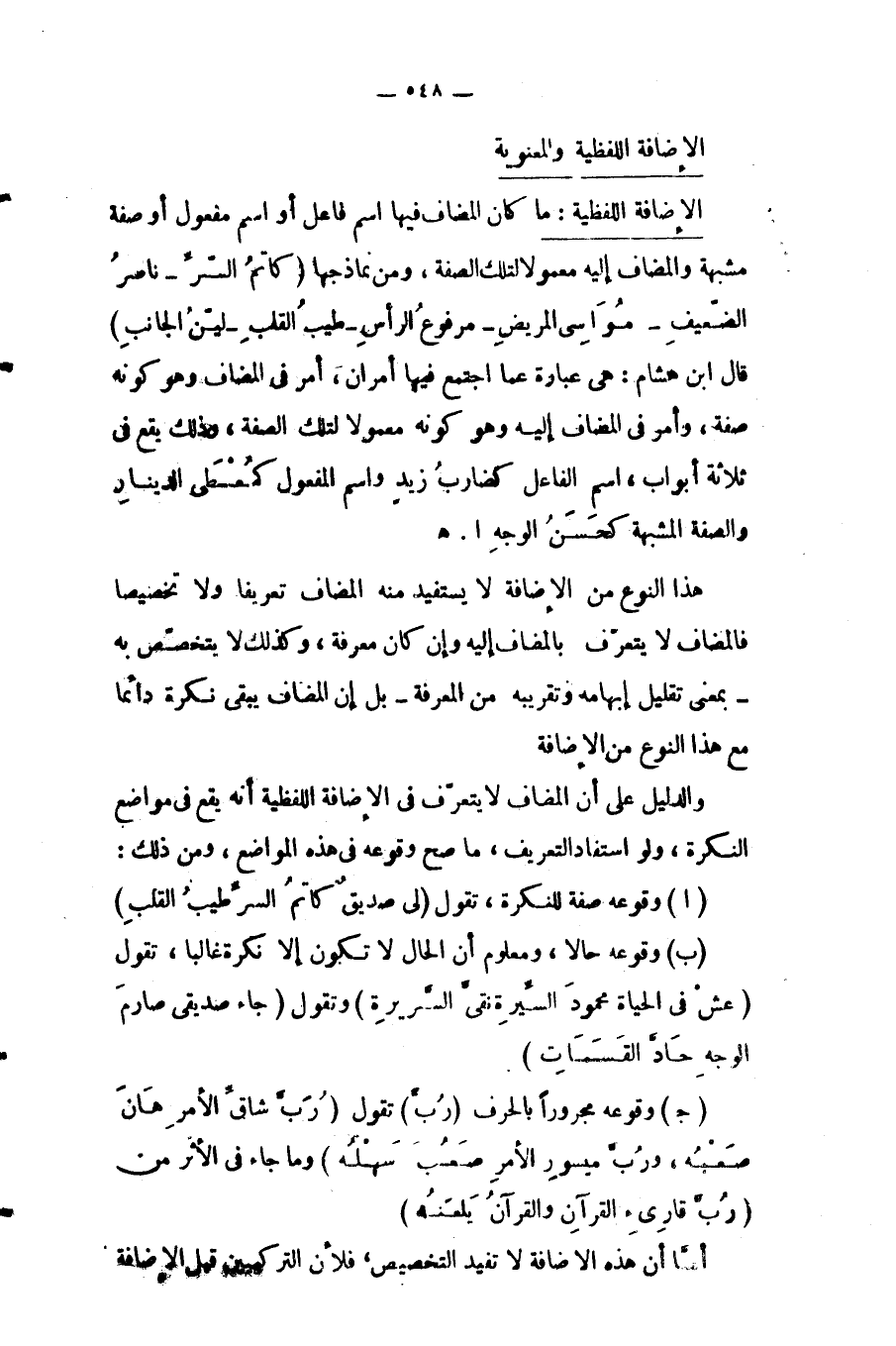 قال ابن هشام: هي عبارة عما اجتمع فيها أمران، أمر في المضاف وهو كونه صفة، وأمر في المضاف إليه وهو كونه معمولا لتلك الصفة، وذلك يقع في ثلاثة أبواب، اسم الفاعل كضارِب زيدٍ، واسم المفعول كمُعْطَى الدينارِ، والصفة المشبهة كحَسَن الوجهِ ا. هـ.