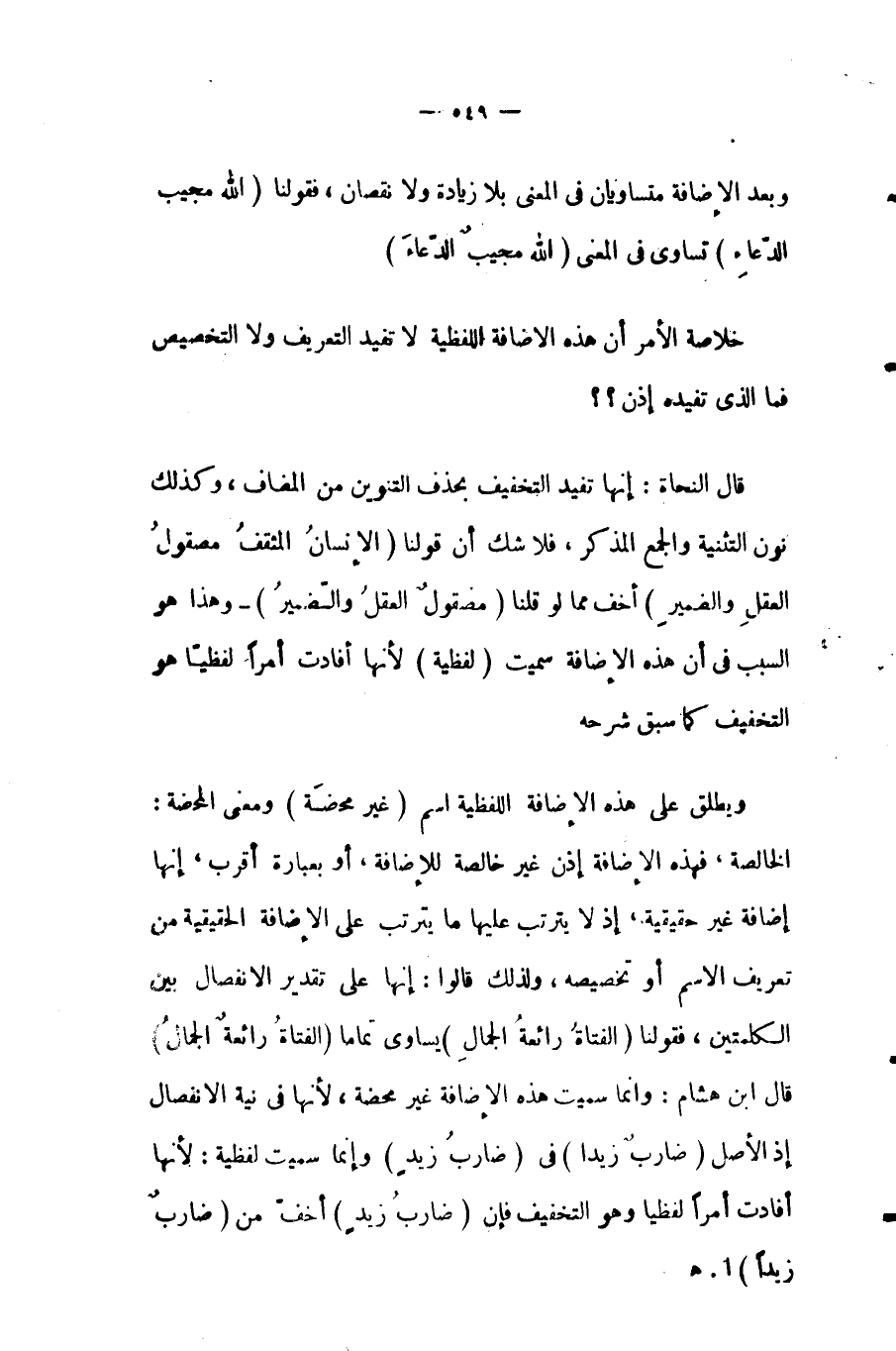 قال ابن هشام: وإنما سميت هذه الإضافة غير محضة، لأنها في نية الانفصال إذ الأصل "ضاربٌ زيدا" في "ضاربُ زيدٍ" وإنما سميت لفظية: لأنها أفادت أمرًا لفظيًّا وهو التخفيف فإن "ضاربُ زيدٍ" أخفّ من "ضاربٌ زيدًا" ا. هـ.