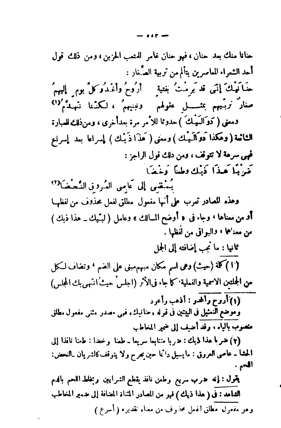 وموضع التمثيل في البيتين في قوله "حنانيك" فهي مصدر مثنى مفعول مطلق منصوب بالياء، وقد أضيف إلى ضمير المخاطب.