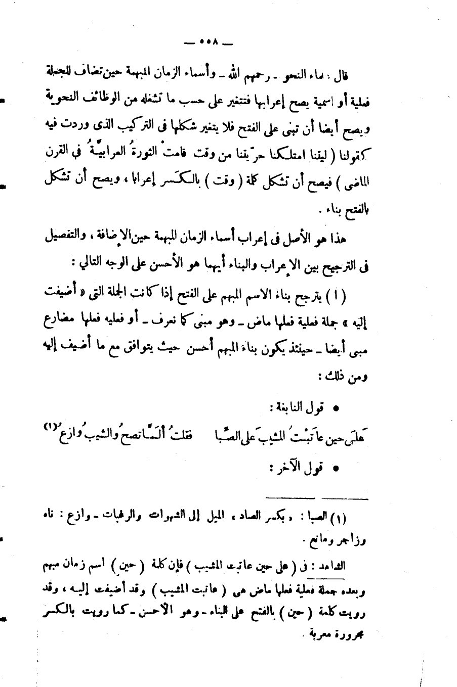 الشاهد: في "على حين عاتبت المشيب" فإن كلمة "حين" اسم زمان مبهم وبعده جملة فعلية فعلها ماضٍ هي "عاتبت المشيب" وقد أضيفت إليه، وقد رويت كلمة "حين" بالفتح على البناء -وهو الأحسن- كما رويت بالكسر مجرورة معربة.