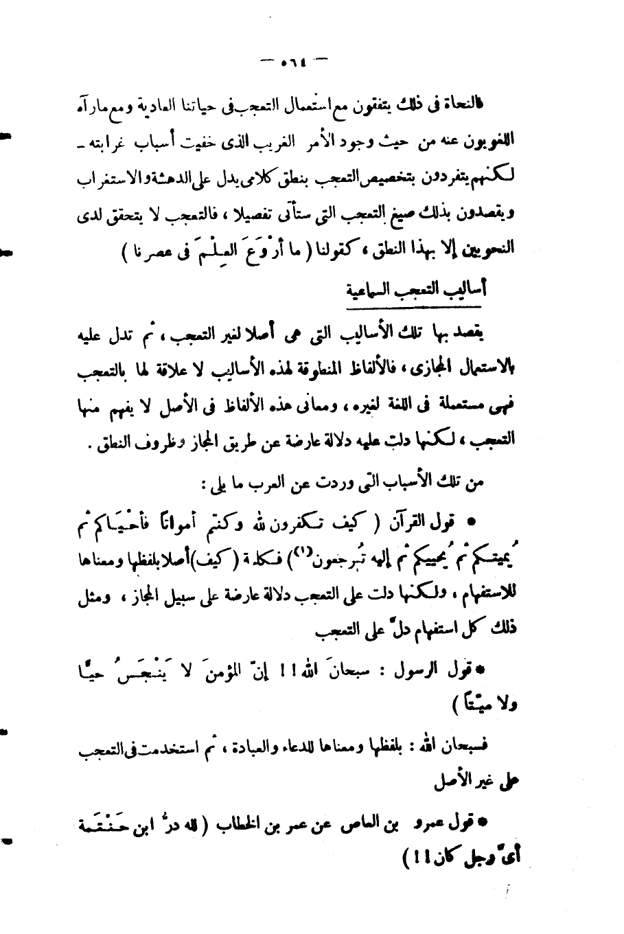 - قول القرآن: {كَيْفَ تَكْفُرُونَ بِاللَّهِ وَكُنْتُمْ أَمْوَاتاً فَأَحْيَاكُمْ ثُمَّ يُمِيتُكُمْ ثُمَّ يُحْيِيكُمْ ثُمَّ إِلَيْهِ تُرْجَعُونَ} ١ فكلمة "كيف" أصلا بلفظها ومعناها للاستفهام، ولكنها دلت على التعجب دلالة عارضة على سبيل المجاز، ومثل ذلك كل استفهام دلَّ على التعجب.