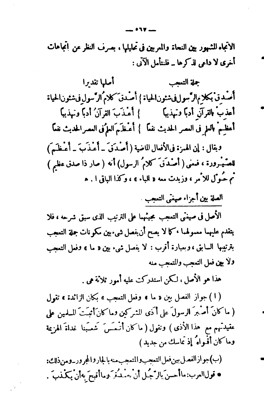 أ- جواز الفصل بين "ما" وفعل التعجب "بكان الزائدة" تقول: "ما كانَ أصْبرَ الرسولَ على أَذَى المشركين، وما كانَ أثبَتَ المسلمين على عقيدتهم مع هذا الأذى" وتقول: "ما كان أتْعَسَ شعبنا غداة الهزيمة، وما كان أقواهُ إذ تماسك من جديد".