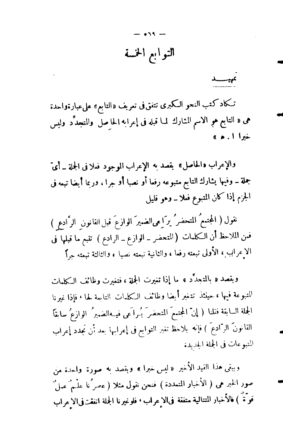 تكاد كتب النحو الكبرى تتفق في تعريف "التابع" على عبارة واحدة هي "التابع هو الاسم المشارك لما قبله في إعرابه الحاصِل والمتجدِّد وليس خبرا ا. هـ".