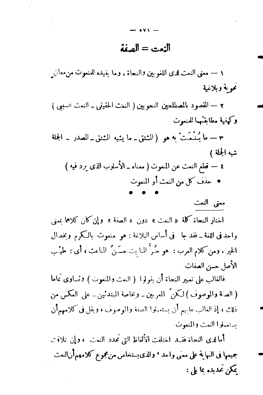 ١- معنى النعت لدى اللغويين والنحاة، وما يفيده للمنعوت من معانٍ نحوية وبلاغية.
