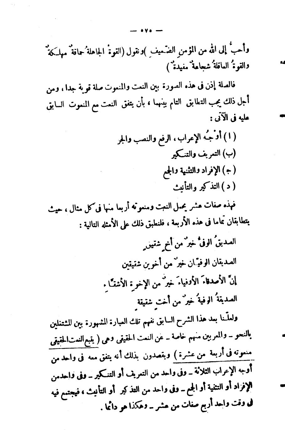 ولعلّنا بعد هذا الشرح السابق نفهم تلك العبارة المشهورة بين المشتغلين بالنحو -والمعربين منهم خاصة- عن النعت الحقيقي وهي: "يتبع النعت الحقيقي منعوته في أربعة من عشرة" ويقصدون بذلك أنه يتفق معه في واحد من أوجه الإعراب الثلاثة، وفي واحد من التعريف أو التنكير، وفي واحد من الإفراد أو التثنية أو الجمع، وفي واحد من التذكير أو التأنيث، فيجتمع فيه في وقت واحد أربع صفات من عشر، وهكذا هو دائما.