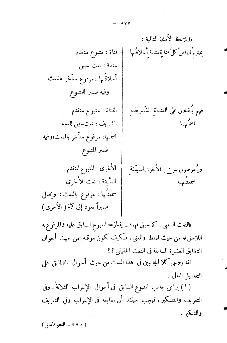 أ- يراعى جانب المتبوع السابق في أحوال الإعراب الثلاثة، وفي التعريف والتنكير، فيجب حينئذٍ أن يطابقه في الإعراب، وفي التعريف والتنكير.