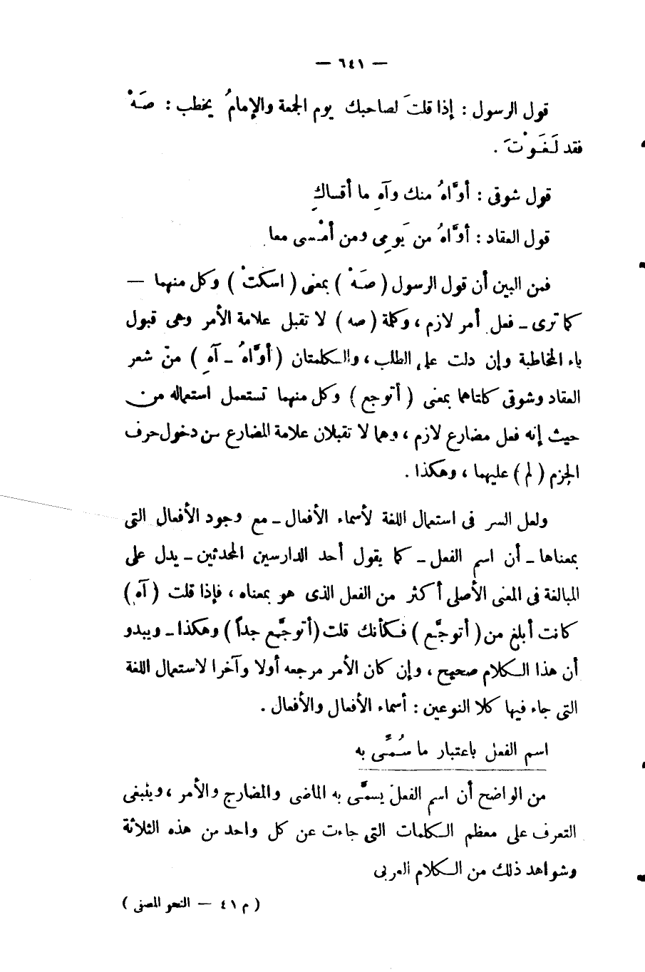 فمن البيّن أن قول الرسول "صَهْ" بمعنى "اسكت" وكل منهما -كما ترى- فعل أمر لازم، وكلمة "صه" لا تقبل علامة الأمر وهي قبول ياء المخاطبة وإن دلت على الطلب، والكلمتان "أوَّاهُ، آهِ" من شعر العقاد وشوقي كلتاهما بمعنى "أتوجع" وكل منهما تستعمل استعماله من حيث إنه فعل مضارع لازم، وهما لا تقبلان علامة المضارع من دخول حرف الجزم "لم" عليهما، وهكذا.