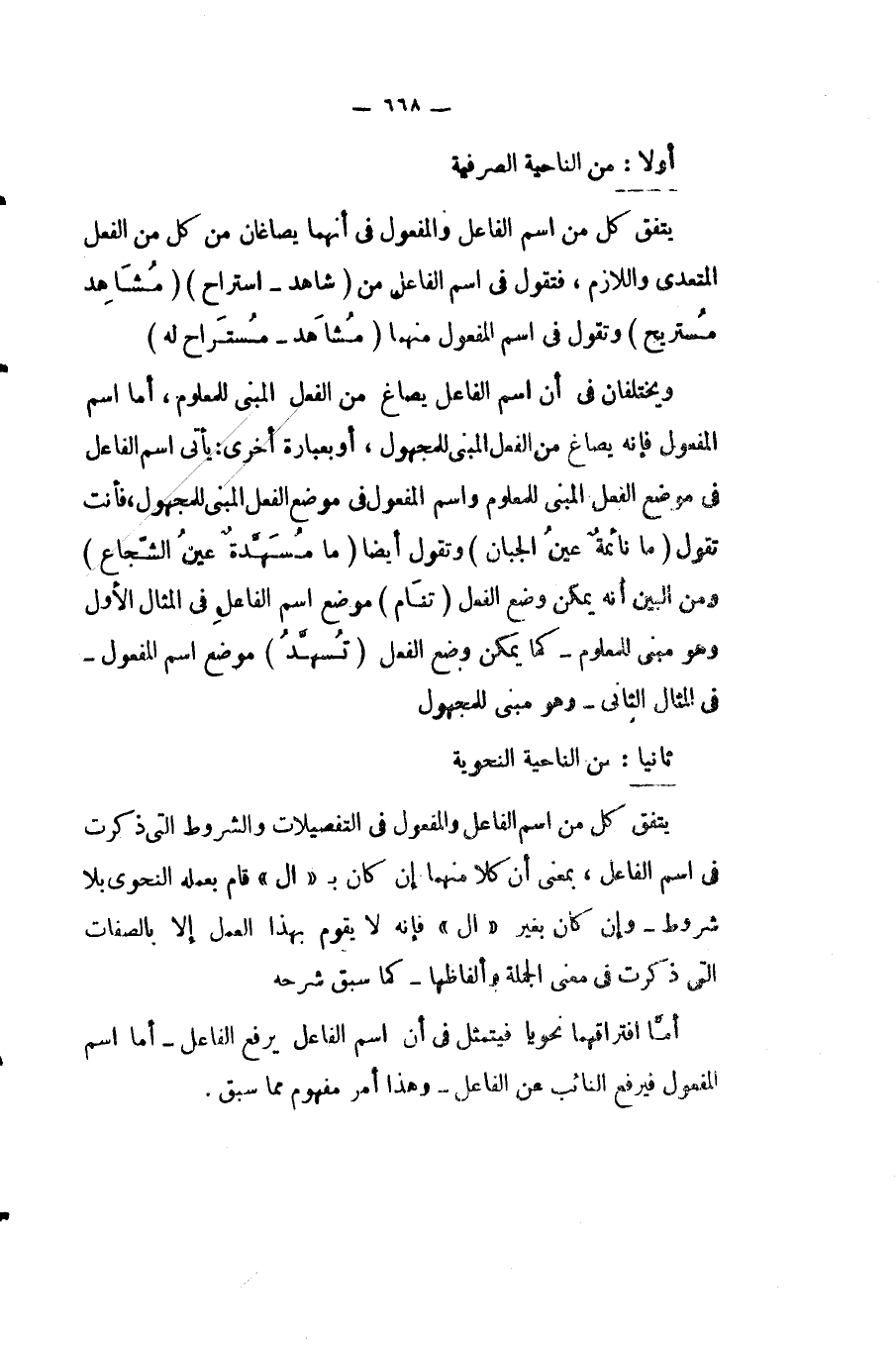 يتفق كل من اسم الفاعل والمفعول في أنهما يصاغان من كل من الفعل المتعدي واللازم، فتقول في اسم الفاعل من "شاهد، استراح": "مُشاهِد، مستريح" وتقول في اسم المفعول منهما: "مُشاهَد، مُستَراح له".