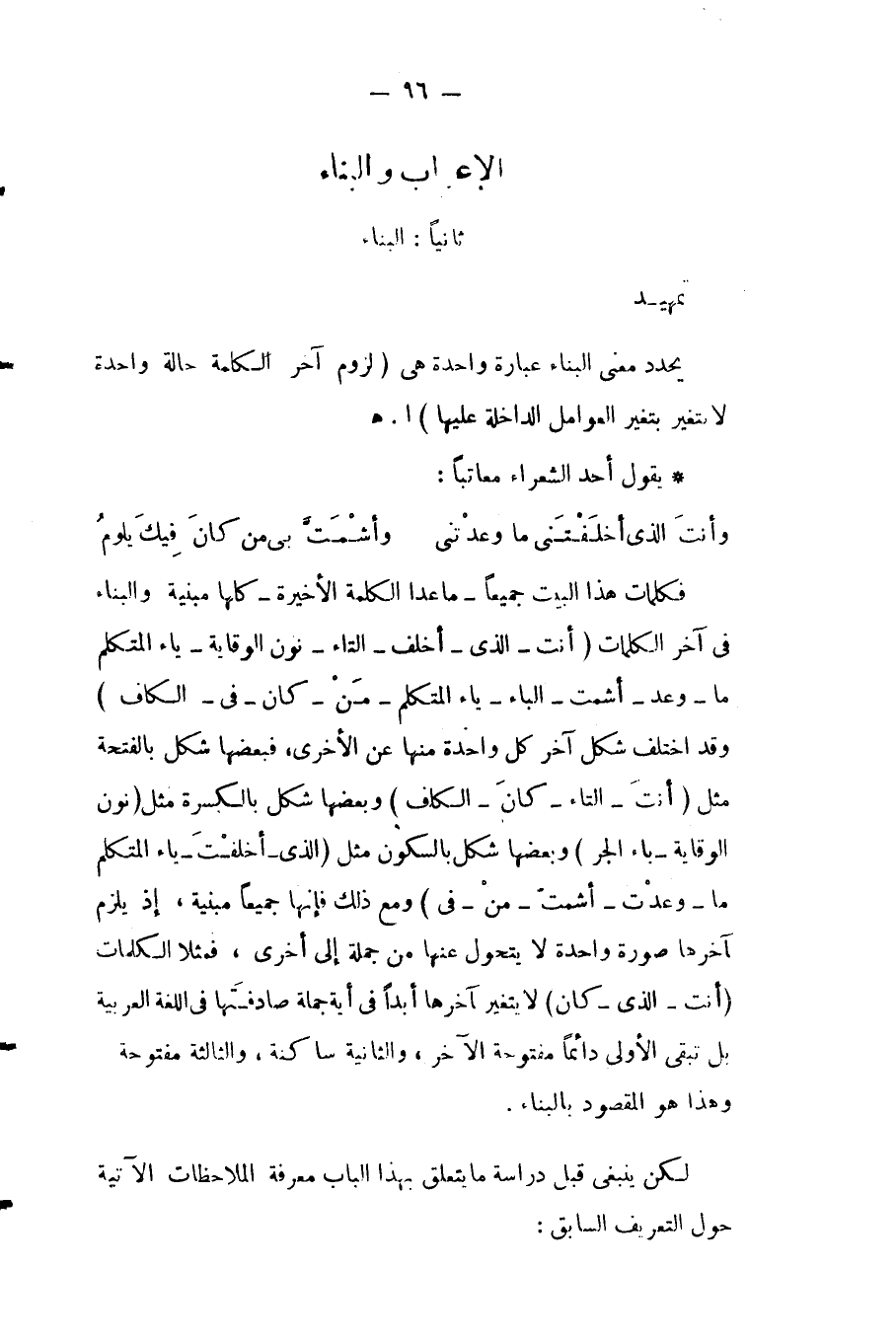 يحدد معنى البناء عبارة واحدة هي: "لزوم آخر الكلمة حالة واحدة لا تتغير بتغير العوامل الداخلة عليها" ا. هـ.