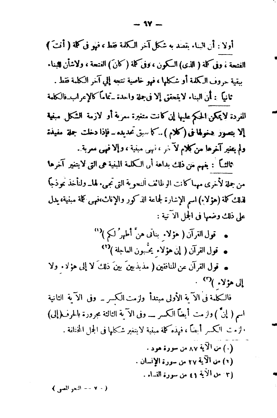 ثالثا: يفهم من ذلك بداهة أن الكلمة المبنية هي التي لا يتغير آخرها من جملة لأخرى مهما كانت الوظائف النحوية التي تجيء لها، ولنأخذ نموذجا لذلك كلمة "هؤلاء" اسم الإشارة لجماعة الذكور والإناث، فهي كلمة مبنية، يدل على ذلك وضعها في الجمل الآتية: