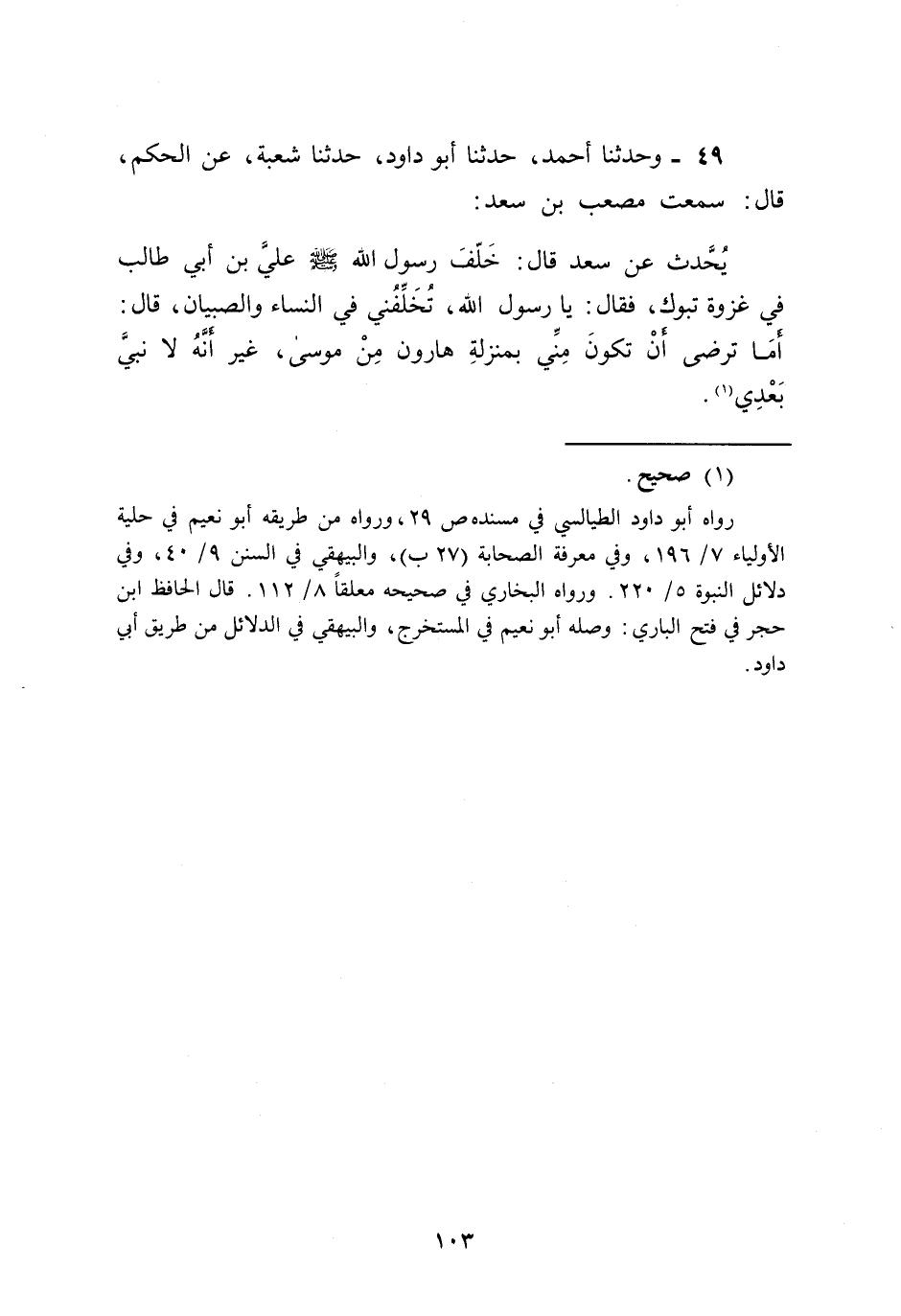 49 - حَدَّثَنَا أَحْمَدُ، حَدَّثَنَا أَبُو دَاوُدَ , حَدَّثَنَا شُعْبَةُ , عَنِ الْحَكَمِ قَالَ: سَمِعْتُ مُصْعَبَ بْنَ سَعْدٍ يُحَدِّثُ , عَنْ سَعْدٍ قَالَ: خَلَّفَ رَسُولُ اللَّهِ صَلَّى اللهُ عَلَيْهِ وَسَلَّمَ عَلِيَّ بْنَ أَبِي طَالِبٍ فِي غَزْوَةِ تَبُوكَ، فَقَالَ: يَا رَسُولَ اللَّهِ تُخَلِّفُنِي فِي النِّسَاءِ وَالصِّبْيَانِ قَالَ: «§أَمَا تَرْضَى أَنْ تَكُونَ مِنِّي بِمَنْزِلَةِ هَارُونَ مِنْ مُوسَى، غَيْرَ أَنَّهُ لَا نَبِيَّ بَعْدِي»