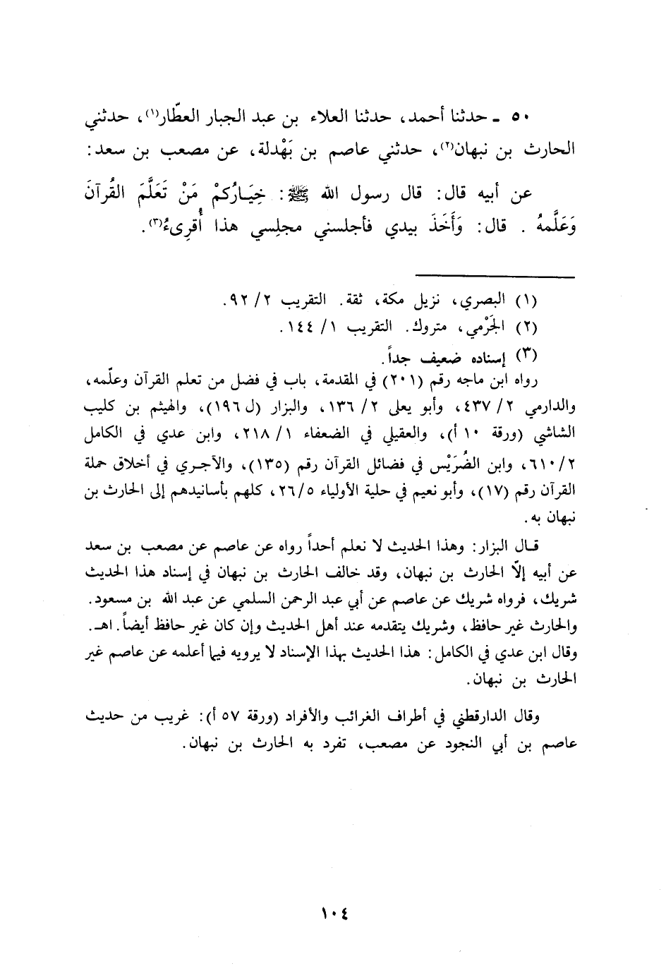50 - حَدَّثَنَا أَحْمَدُ، حَدَّثَنَا الْعَلَاءُ بْنُ عَبْدِ الْجَبَّارِ الْعَطَّارُ، حَدَّثَنِي الْحَارِثُ بْنُ نَبْهَانَ، حَدَّثَنِي عَاصِمُ بْنُ بَهْدَلَةَ عَنْ مُصْعَبِ بْنِ سَعْدٍ عَنْ أَبِيهِ قَالَ: قَالَ رَسُولُ اللَّهِ صَلَّى اللهُ عَلَيْهِ وَسَلَّمَ: «§خِيَارُكُمْ مَنْ تَعَلَّمَ الْقُرْآنَ وَعَلَّمَهُ» ، قَالَ وَأَخَذَ بِيَدِي فَأَجْلَسَنِي مَجْلِسِي هَذَا أُقْرِئُ