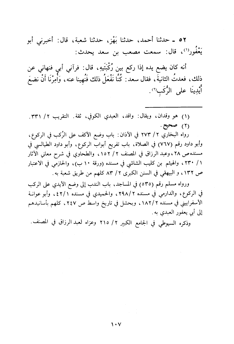 52 - حَدَّثَنَا أَحْمَدُ، حَدَّثَنَا بَهْزٌ , حَدَّثَنَا شُعْبَةُ قَالَ: أَخْبَرَنِي أَبُو يَعْفُورٍ قَالَ: سَمِعْتُ مُصْعَبَ بْنَ سَعْدٍ يُحَدِّثُ أَنَّهُ كَانَ يَضَعُ يَدَهُ إِذَا رَكَعَ بَيْنَ رُكْبَتَيْهِ قَالَ: فَرَآنِي أَبِي فَنَهَانِي عَنْ ذَلِكَ، فَعُدْتُ الثَّانِيَةَ فَقَالَ سَعْدٌ: «§كُنَّا نَفْعَلُ ذَلِكَ فَنُهِينَا عَنْهُ، وَأُمِرْنَا أَنْ نَضَعَ أَيْدِيَنَا عَلَى الرُّكَبِ»