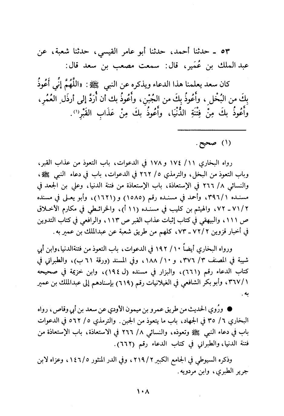 53 - حَدَّثَنَا أَحْمَدُ، حَدَّثَنَا أَبُو عَامِرٍ الْقَيْسِيُّ , حَدَّثَنَا شُعْبَةُ , عَنْ عَبْدِ الْمَلِكِ بْنِ عُمَيْرٍ قَالَ: سَمِعْتُ مُصْعَبَ بْنَ سَعْدٍ قَالَ: كَانَ سَعْدٌ يُعَلِّمُنَا هَذَا الدُّعَاءَ وَيَذْكُرُهُ عَنِ النَّبِيِّ صَلَّى اللهُ عَلَيْهِ وَسَلَّمَ: «§اللَّهُمَّ إِنِّي أَعُوذُ بِكَ مِنَ الْبُخْلِ، وَأَعُوذُ بِكَ مِنَ الْجُبْنِ، وَأَعُوذُ بِكَ أَنْ أُرَدَّ إِلَى أَرْذَلِ الْعُمُرِ، وَأَعُوذُ بِكَ مِنْ فِتْنَةِ الدُّنْيَا، وَأَعُوذُ بِكَ مِنْ عَذَابِ الْقَبْرِ»