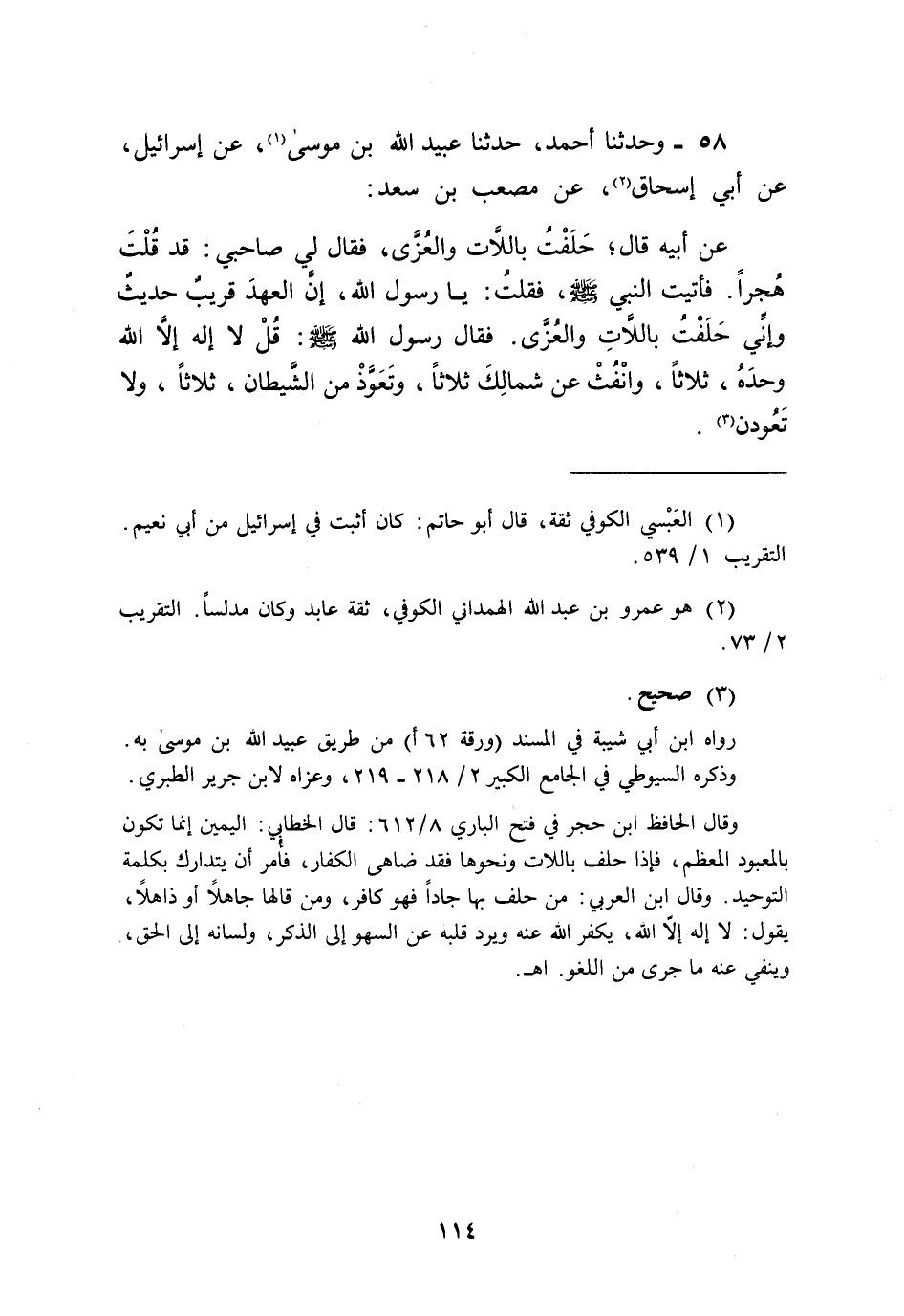 58 - وَحَدَّثَنَا أَحْمَدُ، حَدَّثَنَا عُبَيْدُ اللَّهِ بْنُ مُوسَى , عَنْ إِسْرَائِيلَ , عَنْ أَبِي إِسْحَاقَ , عَنْ مُصْعَبِ بْنِ سَعْدٍ , عَنْ أَبِيهِ قَالَ: حَلَفْتُ بِاللَّاتِ وَالْعُزَّى، فَقَالَ لِي صَاحِبِي: قَدْ قُلْتَ هُجْرًا، فَأَتَيْتُ النَّبِيَّ صَلَّى اللهُ عَلَيْهِ وَسَلَّمَ فَقُلْتُ: يَا رَسُولَ اللَّهِ إِنَّ الْعَهْدَ قَرِيبٌ حَدِيثٌ وَإِنِّي حَلَفْتُ بِاللَّاتِ وَالْعُزَّى فَقَالَ رَسُولُ اللَّهِ صَلَّى اللهُ عَلَيْهِ وَسَلَّمَ: " §قُلْ: لَا إِلَهَ إِلَا اللَّهُ وَحْدَهُ ثَلَاثًا، وَانْفُثْ عَنْ شِمَالِكَ ثَلَاثًا، وَتَعَوَّذْ مِنَ الشَّيْطَانِ ثَلَاثًا، وَلَا تَعُودَنَّ "