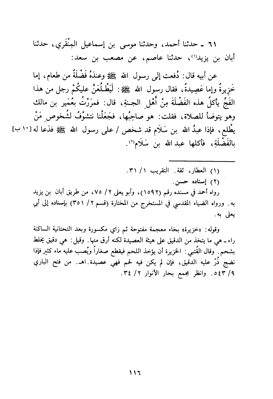 61 - حَدَّثَنَا أَحْمَدُ، وَحَدَّثَنَا مُوسَى بْنُ إِسْمَاعِيلَ الْمِنْقَرِيُّ , حَدَّثَنَا أَبَانُ بْنُ يَزِيدَ , حَدَّثَنَا عَاصِمٌ , عَنْ مُصْعَبِ بْنِ سَعْدٍ , عَنْ أَبِيهِ قَالَ: دُفِعْتُ إِلَى رَسُولِ اللَّهِ صَلَّى اللهُ عَلَيْهِ وَسَلَّمَ وَعِنْدَهُ فَضْلَةٌ مِنْ طَعَامِ إِمَّا خَزِيرَةٌ وَإِمِّا عَصِيدَةٌ فَقَالَ رَسُولُ اللَّهِ صَلَّى اللهُ عَلَيْهِ وَسَلَّمَ: «§لَيَطْلَعَنَّ عَلَيْكُمْ رَجُلٌ مِنْ هَذَا الْفَجِّ يَأْكُلُ هَذِهِ الْفَضْلَةِ مِنْ أَهْلِ الْجَنَّةِ» , قَالَ فَمَرَرْتُ بِعُمَيْرِ بْنِ مَالِكٍ وَهُوَ يَتَوَضَّأُ لِلصَّلَاةِ، فَقُلْتُ: هُوَ صَاحِبُهَا، فَجَعَلْنَا نَتَشَوَّفُ لِشُخُوصِ مَنْ يَطْلُعُ، فَإِذَا عَبْدُ اللَّهِ بْنِ سَلَامِ قَدْ شَخَصَ عَلَى رَسُولِ اللَّهِ صَلَّى اللهُ عَلَيْهِ وَسَلَّمَ فَدَعَا لَهُ بِالْفَضْلَةِ، فَأَكَلَهَا عَبْدُ اللَّهِ بْنُ سَلَّامِ