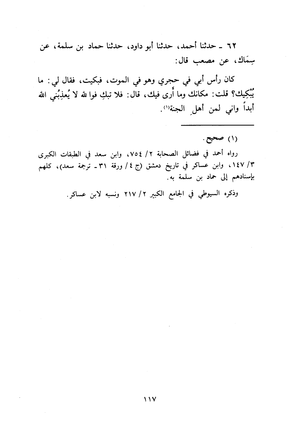 62 - حَدَّثَنَا أَحْمَدُ، حَدَّثَنَا أَبُو دَاوُدَ , حَدَّثَنَا حَمَّادُ بْنُ سَلَمَةَ , عَنْ سِمَاكٍ , عَنْ مُصْعَبٍ قَالَ: " §كَانَ رَأْسُ أَبِي فِي حِجْرِي، وَهُوَ فِي الْمَوْتِ فَبَكَيْتُ، فَقَالَ لِي: مَا يُبْكِيكَ؟ قُلْتُ: مَكَانُكَ وَمَا أَرَى فِيكَ، قَالَ: فَلَا تَبْكِ، فَوَاللَّهِ لَا يُعَذِّبُنِي اللَّهُ أَبَدًا وَإِنِّي لَمِنْ أَهْلِ الْجَنَّةِ "