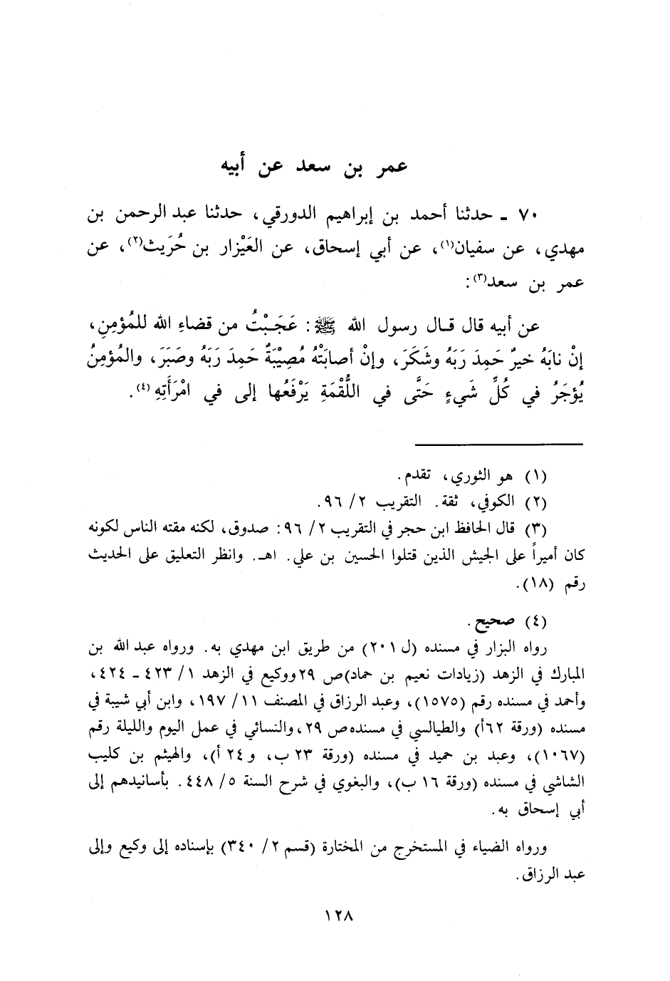 70 - حَدَّثَنَا أَحْمَدُ بْنُ إِبْرَاهِيمَ الدَّوْرَقِيُّ، حَدَّثَنَا عَبْدُ الرَّحْمَنِ بْنُ مَهْدِيٍّ , عَنْ سُفْيَانَ , عَنْ أَبِي إِسْحَاقَ , عَنِ الْعَيْزَارِ بْنِ حُرَيْثٍ , عَنْ عُمَرَ بْنِ سَعْدٍ , عَنْ أَبِيهِ قَالَ: قَالَ رَسُولُ اللَّهِ صَلَّى اللهُ عَلَيْهِ وَسَلَّمَ: «§عَجِبْتُ مِنْ قَضَاءِ اللَّهِ لِلْمُؤْمِنِ، إِنْ نَابَهُ خَيْرٌ حَمِدَ رَبَّهُ وَشَكَرَ، وَإِنْ أَصَابَتْهُ مُصِيبَةٌ حَمِدَ رَبَّهُ وَصَبَرَ، وَالْمُؤْمِنُ يُؤْجَرُ فِي كُلِّ شَيْءٍ حَتَّى فِي اللُّقْمَةِ يَرْفَعُهَا إِلَى فِي امْرَأَتِهِ»