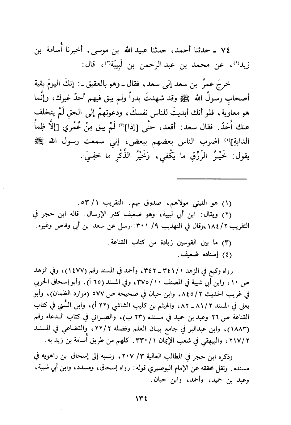 74 - حَدَّثَنَا أَحْمَدُ، حَدَّثَنَا عُبَيْدُ اللَّهِ بْنُ مُوسَى، أَخْبَرَنَا أُسَامَةُ بْنُ زَيْدٍ , عَنْ مُحَمَّدِ بْنِ عَبْدِ الرَّحْمَنِ بْنِ لَبِيبَةَ قَالَ: خَرَجَ عُمَرُ بْنُ سَعْدٍ إِلَى سَعْدٍ فَقَالَ - وَهُوَ بِالْعَقِيقِ -: إِنَّكَ الْيَوْمَ بَقِيَّةُ أَصْحَابِ رَسُولِ اللَّهِ صَلَّى اللهُ عَلَيْهِ وَسَلَّمَ وَقَدْ شَهِدْتَ بَدْرًا وَلَمْ يَبْقَ فِيهِمْ أَحَدٌ غَيْرُكَ وَإِنَّمَا هُوَ مُعَاوِيَةُ فَلَوْ أَنَّكَ أَبْدَيْتَ لِلنَّاسِ نَفْسَكَ وَدَعْوَتَهُمْ إِلَى الْحَقِّ لَمْ يَتَخَلَّفْ عَنْكَ أَحَدٌ، فَقَالَ سَعْدٌ: أَقْعُدُ حَتَّى إذا لَمْ يَبْقَ مِنْ عُمْرِي إِلَّا ظَمَأُ الدَّابَّةِ أَضْرِبُ النَّاسَ بَعْضَهُمْ بِبَعْضٍ، إِنِّي سَمِعْتُ رَسُولَ اللَّهِ صَلَّى اللهُ عَلَيْهِ وَسَلَّمَ يَقُولُ: «§خَيْرُ الرِّزْقِ مَا يَكْفِي وَخَيْرُ الذِّكْرِ مَا خَفِيَ»