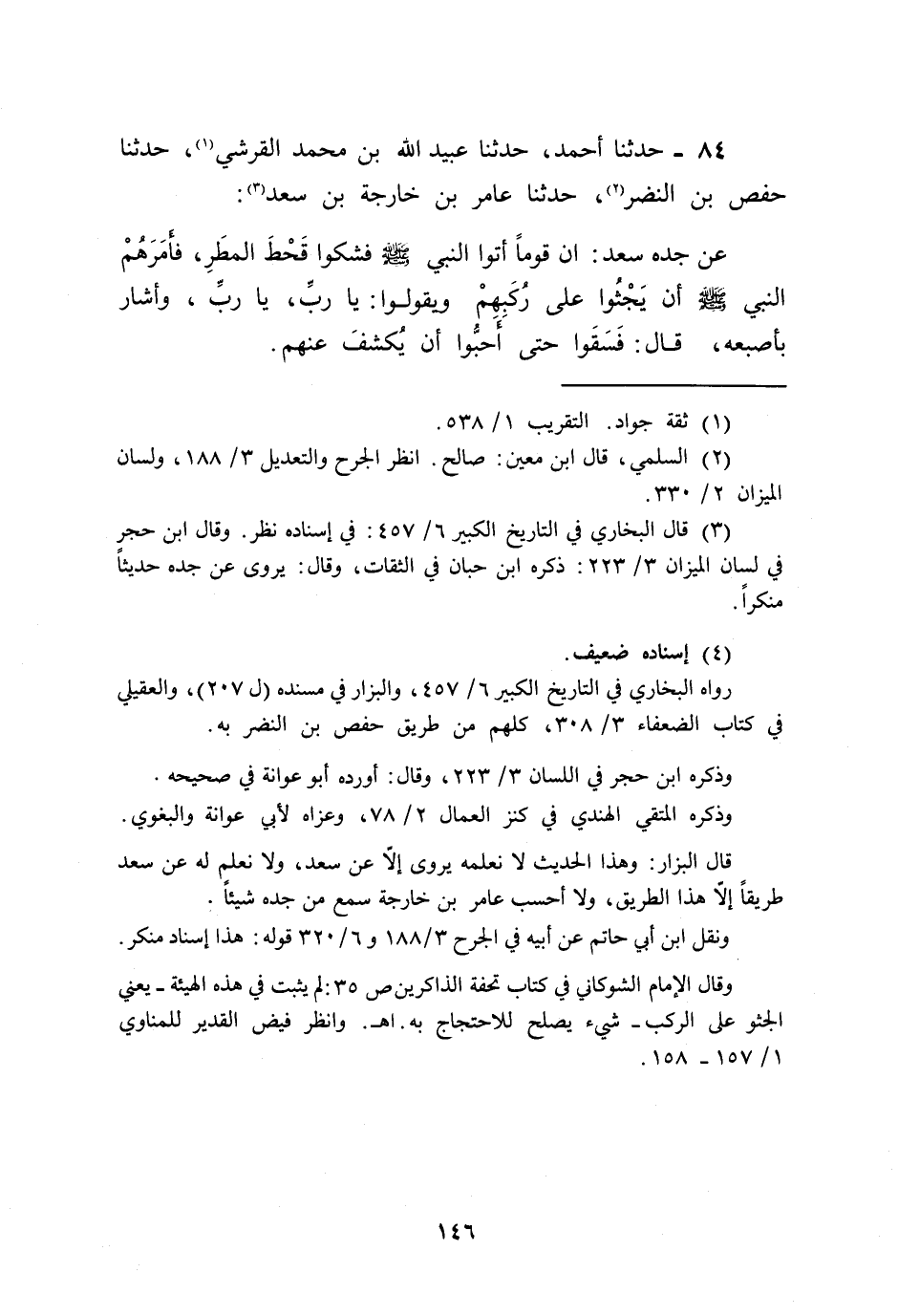 84 - حَدَّثَنَا أَحْمَدُ، حَدَّثَنَا عُبَيْدُ اللَّهِ بْنُ مُحَمَّدٍ الْقُرَشِيُّ , حَدَّثَنَا حَفْصُ بْنُ النَّضْرِ , حَدَّثَنَا عَامِرُ بْنُ خَارِجَةَ بْنِ سَعْدٍ , عَنْ جَدِّهِ سَعْدٍ أَنَّ §قَوْمًا أَتَوُا النَّبِيَّ صَلَّى اللهُ عَلَيْهِ وَسَلَّمَ فَشَكَوْا قَحْطَ الْمَطَرَ فَأَمَرَهُمُ النَّبِيُّ صَلَّى اللهُ عَلَيْهِ وَسَلَّمَ أَنْ يَجْثُوا عَلَى رُكَبِهِمْ وَيَقُولُوا: يَا رَبِّ يَا رَبِّ وَأَشَارَ بِأُصْبُعِهِ قَالَ: فَسَقَوْا حَتَّى أَحَبُّوا أَنْ يُكْشَفَ عَنْهُمْ