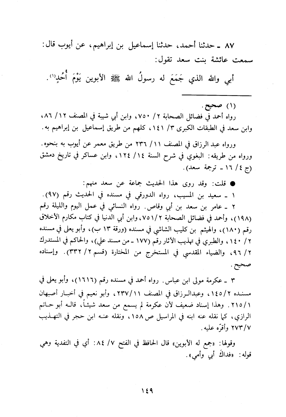 87 - حَدَّثَنَا أَحْمَدُ، حَدَّثَنَا إِسْمَاعِيلُ بْنُ إِبْرَاهِيمَ عَنْ أَيُّوبَ قَالَ: سَمِعْتُ عَائِشَةَ بِنْتَ سَعْدٍ تَقُولُ: «§أَبِي وَاللَّهِ الَّذِي جَمَعَ لَهُ رَسُولُ اللَّهِ صَلَّى اللهُ عَلَيْهِ وَسَلَّمَ الْأَبَوَيْنِ يَوْمَ أُحُدٍ»
