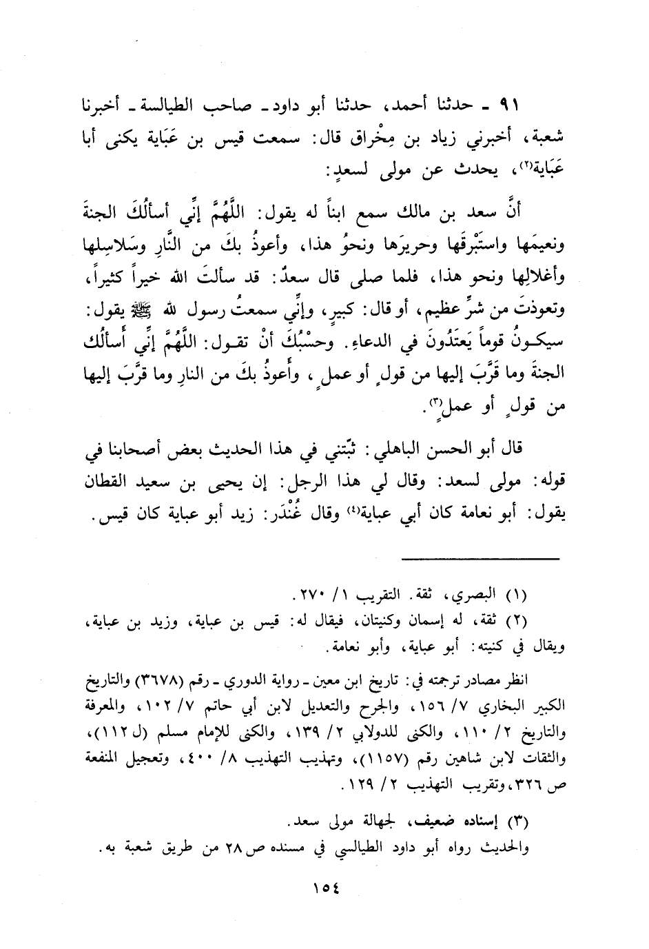 91 - حَدَّثَنَا أَحْمَدُ، حَدَّثَنَا أَبُو دَاوُدَ صَاحِبُ الطَّيَالِسَةِ , أَخْبَرَنَا شُعْبَةُ , أَخْبَرَنِي زِيَادُ بْنُ مِخْرَاقٍ قَالَ: سَمِعْتُ قَيْسَ بْنَ عَبَايَةَ يُكْنَى أَبَا عَبَايَةَ يُحَدِّثُ , عَنْ مَوْلًى لِسَعْدٍ: أَنَّ سَعْدَ بْنَ مَالِكٍ سَمِعَ ابْنًا لَهُ يَقُولُ: اللَّهُمَّ إِنِّي أَسْأَلُكَ الْجَنَّةَ وَنَعِيمَهَا وَإِسْتَبْرَقَهَا وَحَرِيرَهَا وَنَحْوَ هَذَا وَأَعُوذُ بِكَ مِنَ النَّارِ وَسَلَاسِلَهَا وَأَغْلَالَهَا وَنَحْوَ هَذَا فَلَمَّا صَلَّى قَالَ سَعْدٌ: قَدْ سَأَلْتَ اللَّهَ خَيْرًا كَثِيرًا وَتَعَوَّذْتَ مِنْ شَرِّ عَظِيمٍ أَوْ قَالَ كَبِيرٍ وَإِنِّي سَمِعْتُ رَسُولَ اللَّهِ صَلَّى اللهُ عَلَيْهِ وَسَلَّمَ يَقُولُ: " §سَيَكُونُ قَوْمًا يَعْتَدُونَ فِي الدُّعَاءِ وَحَسْبُكَ أَنْ تَقُولَ: اللَّهُمَّ إِنِّي أَسْأَلُكَ الْجَنَّةَ وَمَا قَرَّبَ إِلَيْهَا مِنْ قَوْلٍ أَوْ عَمَلٍ وَأَعُوذُ بِكَ مِنَ النَّارِ وَمَا قَرَّبَ إِلَيْهَا مِنْ قَوْلٍ أَوْ عَمَلٍ " قَالَ أَبُو الْحَسَنِ الْبَاهِلِيُّ: ثَبَّتَنِي فِي هَذَا الْحَدِيثِ بَعْضُ أَصْحَابِنَا فِي قَوْلِهِ: مَوْلًى لِسَعْدٍ، وَقَالَ لِي هَذَا الرَّجُلُ: إِنَّ يَحْيَى بْنَ سَعِيدٍ الْقَطَّانَ يَقُولُ: أَبُو نَعَامَةَ مَكَانَ أَبِي عَبَايَةَ، وَقَالَ غُنْدَرٌ: زَيْدٌ أَبُو عَبَايَةَ مَكَانَ قَيْسٍ