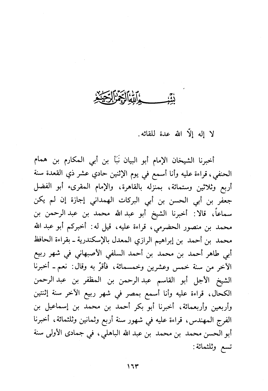 أَخْبَرَنَا الشَّيْخَانِ: الْإِمَامُ أَبُو الْبَيَانِ نبأ ابْنُ أَبِي الْمَكَارِمِ بْنِ هَجَّامٍ الْحَنَفِيُّ قِرَاءَةً عَلَيْهِ وَأَنَا أَسْمَعُ فِي يَوْمِ الْإِثْنَيْنِ حَادِي عَشَرَ ذِي الْقِعْدَةِ سَنَةَ أَرْبَعٍ وَثَلاَثِينَ وَسِتِّمِائَةٍ بِمَنْزِلِهِ بِالْقَاهِرَةِ، وَالْإِمَامُ الْمُقْرِئُ أَبُو الْفَضْلِ جَعْفَرُ بْنُ أَبِي الْحَسَنِ بْنِ أَبِي الْبَرَكَاتِ الْهَمْدَانِيُّ إِجَازَةً إِنْ لَمْ يَكُنْ سَمَاعًا قَالَ: لِكُلِّ وَاحِدٍ مِنْهُمَا قَالَا: أَخْبَرَنَا أَبُو عَبْدِ اللَّهِ مُحَمَّدُ بْنُ عَبْدِ الرَّحْمَنِ بْنِ مُحَمَّدِ بْنِ مَنْصُورِ بْنِ مُحَمَّدِ بْنِ الْفَضْلِ الْحَضْرَمِيُّ، قِرَاءَةً عَلَيْهِ قَالَ: أَخْبَرَنَا أَبُو عَبْدِ اللَّهِ مُحَمَّدُ بْنُ أَحْمَدَ بْنِ إِبْرَاهِيمَ الرَّازِيُّ الْمُعَدِّلُ بِالْأَسْكَنْدَرِيَّةِ، بِقَرَاءَةِ الْحَافِظِ أَبِي طَاهِرٍ أَحْمَدَ السَّلَفِيِّ فِي شَهْرِ رَبِيعٍ الْآخَرِ سَنَةَ خَمْسٍ وَعِشْرِينَ وَخَمْسِمِائَةٍ فَأَقَرَّ بِهِ وَقَالَ: نَعَمْ أَخْبَرَنَا الشَّيْخُ الْأَجَلُّ أَبُو الْقَاسِمِ عَبْدُ الرَّحْمَنِ بْنُ الْمُظَفَّرِ بْنِ عَبْدِ الرَّحْمَنِ الْكَحَّالُ فِي شَهْرِ رَبِيعٍ الْآخَرِ سَنَةَ اثْنَتَيْنِ وَأَرْبَعِينَ وَأَرْبَعِمِائَةٍ، أَخْبَرَنَا أَبُو بَكْرٍ أَحْمَدُ بْنُ مُحَمَّدِ بْنِ إِسْمَاعِيلَ بْنِ الْفَرَجِ الْمُهَنِّدِسُ قِرَاءَةً عَلَيْهِ فِي شُهُورِ سَنَةِ أَرْبَعٍ وَثَمَانِينَ وَثَلَاثِمِائَةٍ أَخْبَرَنَا أَبُو الْحَسَنِ مُحَمَّدُ بْنُ مُحَمَّدِ بْنِ عَبْدِ اللَّهِ الْبَاهِلِيُّ فِي جُمَادَى الْأُولَى سَنَةَ تِسْعٍ وَثَلَاثِمِائَةٍ