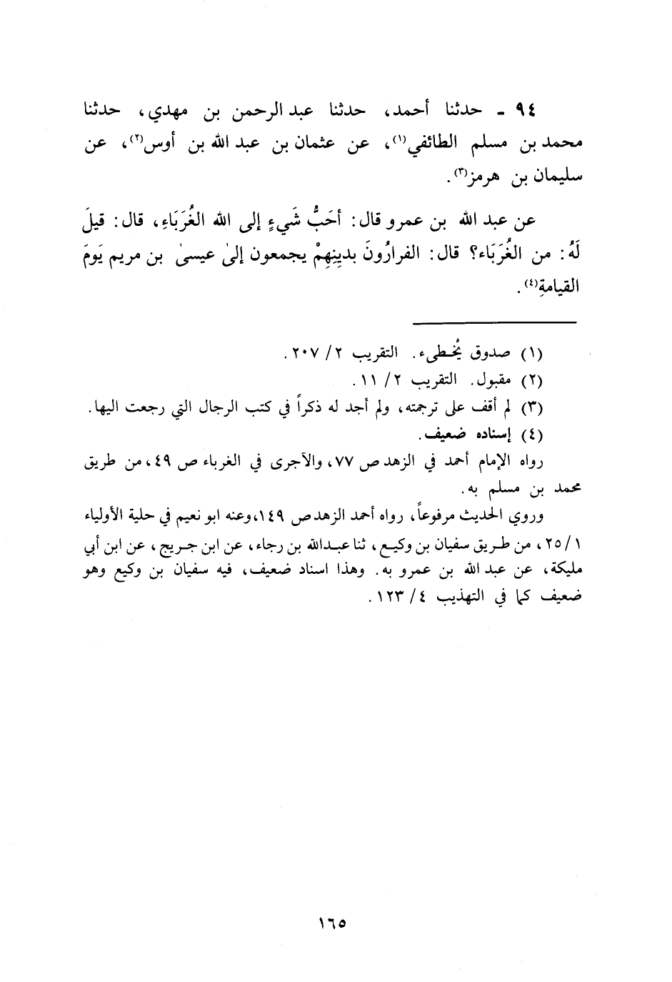 94 - حَدَّثَنَا أَحْمَدُ، حَدَّثَنَا عَبْدُ الرَّحْمَنِ بْنُ مَهْدِيٍّ , حَدَّثَنَا مُحَمَّدُ بْنُ مُسْلِمٍ الطَّائِفِيُّ , عَنْ عُثْمَانَ بْنِ عَبْدِ اللَّهِ بْنِ أَوْسٍ , عَنْ سُلَيْمَانَ بْنِ هُرْمُزٍ , عَنْ عَبْدِ اللَّهِ بْنِ عَمْرٍو قَالَ: " §أَحَبُّ شَيْءٍ إِلَى اللَّهِ الْغُرَبَاءُ قَالَ: قِيلَ لَهُ: مَنِ الْغُرَبَاءِ؟ قَالَ: الْفَرَّارُونَ بِدِينِهِمْ يُجْمَعُونَ إِلَى عِيسَى ابْنِ مَرْيَمَ يَوْمَ الْقِيَامَةِ "
