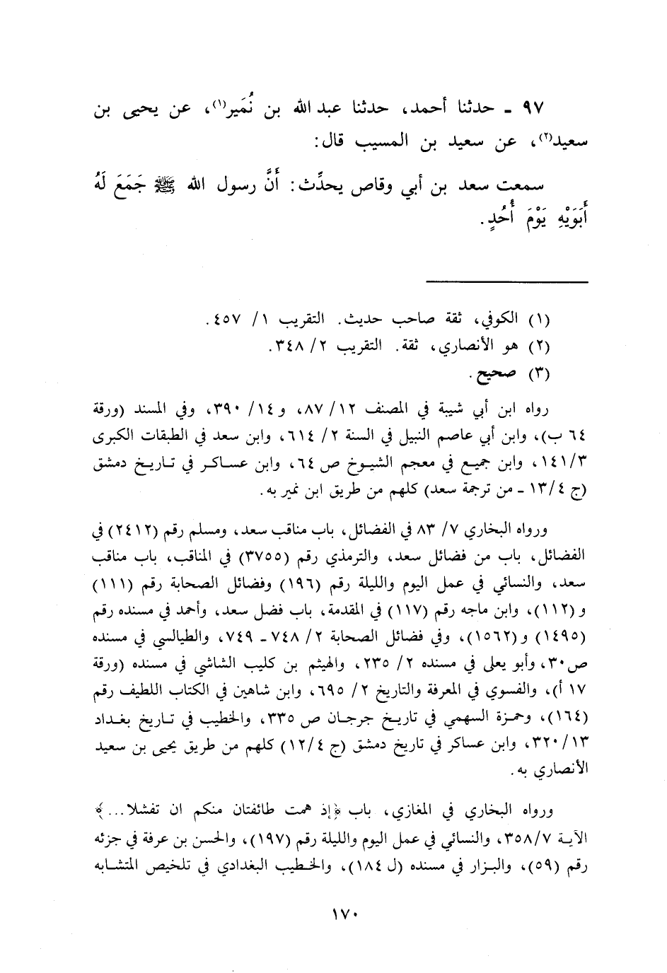 97 - حَدَّثَنَا أَحْمَدُ، حَدَّثَنَا عَبْدُ اللَّهِ بْنُ نُمَيْرٍ , عَنْ يَحْيَى بْنِ سَعِيدٍ , عَنْ سَعِيدِ بْنِ الْمُسَيِّبِ قَالَ: سَمِعْتُ سَعْدَ بْنَ أَبِي وَقَّاصٍ يُحَدِّثُ §أَنَّ رَسُولَ اللَّهِ صَلَّى اللهُ عَلَيْهِ وَسَلَّمَ جَمَعَ لَهُ أَبَوَيْهِ يَوْمَ أُحُدٍ