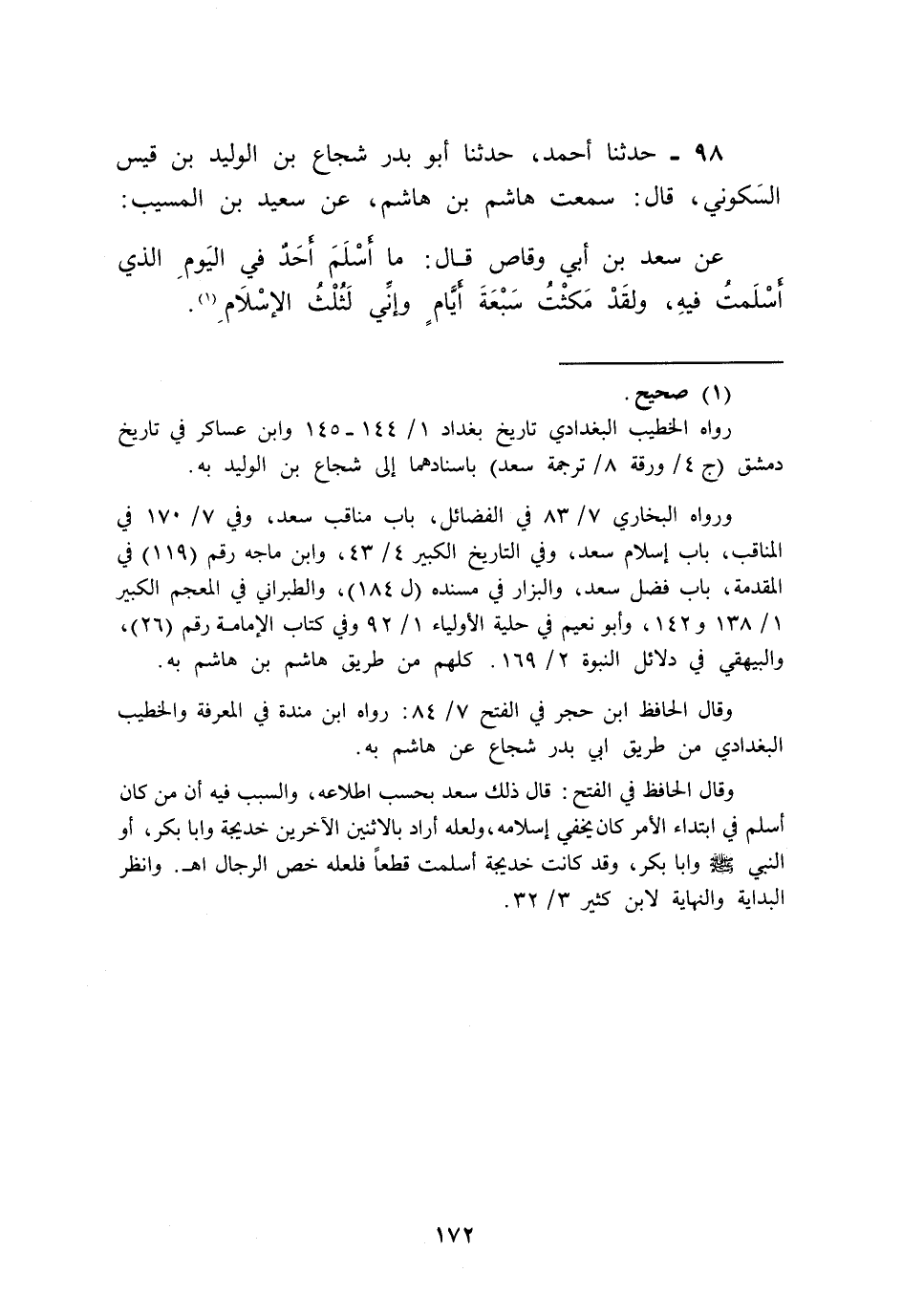98 - حَدَّثَنَا أَحْمَدُ، حَدَّثَنَا أَبُو بَدْرٍ شُجَاعُ بْنُ الْوَلِيدِ بْنِ قَيْسٍ السَّكُونِيُّ قَالَ: سَمِعْتُ هَاشِمَ بْنَ هَاشِمٍ , عَنْ سَعِيدِ بْنِ الْمُسَيِّبِ , عَنْ سَعْدِ بْنِ أَبِي وَقَّاصٍ قَالَ: «§مَا أَسْلَمَ أَحَدٌ فِي الْيَوْمِ الَّذِي أَسْلَمْتُ فِيهِ، وَلَقَدْ مَكَثْتُ سَبْعَةَ أَيَّامٍ وَإِنِّي لَثُلُثُ الْإِسْلَامِ»