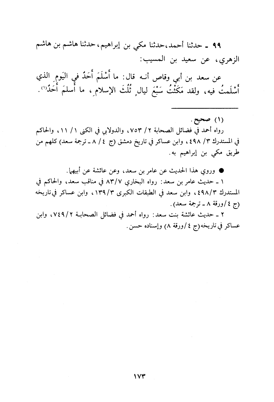99 - حَدَّثَنَا أَحْمَدُ، حَدَّثَنَا مَكِّيُّ بْنُ إِبْرَاهِيمَ , حَدَّثَنَا هَاشِمُ بْنُ هَاشِمٍ الزُّهْرِيُّ , عَنْ سَعِيدِ بْنِ الْمُسَيِّبِ , عَنْ سَعْدِ بْنِ أَبِي وَقَّاصٍ أَنَّهُ قَالَ: «§مَا أَسْلَمَ أَحَدٌ فِي الْيَوْمِ الَّذِي أَسْلَمْتُ فِيهِ، وَلَقَدْ مَكَثْتُ سَبْعَ لَيَالٍ ثُلُثَ الْإِسْلَامِ مَا أَسْلَمَ أَحَدٌ»