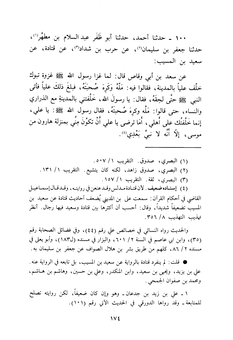 100 - حَدَّثَنَا أَحْمَدُ، حَدَّثَنَا أَبُو ظُفُرٍ عَبْدُ السَّلَامِ بْنُ مُطَهَّرٍ , حَدَّثَنَا جَعْفَرُ بْنُ سُلَيْمَانَ , عَنْ حَرْبِ بْنِ شَدَّادٍ , عَنْ قَتَادَةَ , عَنْ سَعِيدِ بْنِ الْمُسَيِّبِ , عَنْ سَعْدِ بْنِ أَبِي وَقَّاصٍ قَالَ: لَمَّا غَزَا رَسُولُ اللَّهِ غَزْوَةَ تَبُوكَ خَلَّفَ عَلِيًّا بِالْمَدِينَةِ فَقَالُوا فِيهِ: مَلَّهُ وَكَرِهَ صُحْبَتَهُ فَبَلَغَ ذَلِكَ عَلِيًّا فَأَتَى النَّبِيَّ صَلَّى اللهُ عَلَيْهِ وَسَلَّمَ حَتَّى لَحِقَهُ فَقَالَ: يَا رَسُولَ اللَّهِ خَلَّفْتَنِي بِالْمَدِينَةِ مَعَ الذَّرَارِي وَالنِّسَاءِ حَتَّى قَالُوا: مَلَّهُ وَكَرِهَ صُحْبَتَهُ فَقَالَ رَسُولُ اللَّهِ صَلَّى اللهُ عَلَيْهِ وَسَلَّمَ: «يَا عَلِيُّ §إِنَّمَا خَلَّفْتُكَ عَلَى أَهْلِي أَمَا تَرْضَى يَا عَلِيُّ أَنْ تَكُونَ مِنِّي بِمَنْزِلَةِ هَارُونَ مِنْ مُوسَى إِلَّا أَنَّهُ لَا نَبِيَّ بَعْدِي»