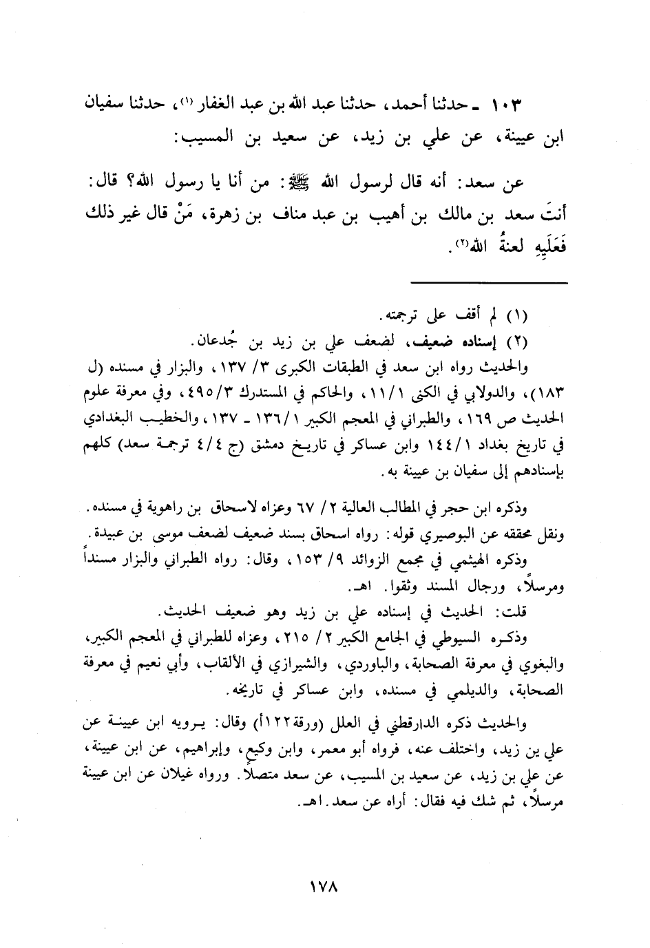 103 - حَدَّثَنَا أَحْمَدُ، حَدَّثَنَا عَبْدُ اللَّهِ بْنُ عَبْدِ الْغَفَّارِ , حَدَّثَنَا سُفْيَانُ بْنُ عُيَيْنَةَ , عَنْ عَلِيِّ بْنِ زَيْدٍ , عَنْ سَعِيدِ بْنِ الْمُسَيِّبِ , عَنْ سَعْدٍ أَنَّهُ قَالَ لِرَسُولِ اللَّهِ صَلَّى اللهُ عَلَيْهِ وَسَلَّمَ: مَنْ أَنَا يَا رَسُولَ اللَّهِ؟ قَالَ: «§أَنْتَ سَعْدُ بْنُ مَالِكِ بْنِ أُهَيْبِ بْنِ عَبْدِ مَنَافِ بْنِ زُهْرَةَ، مَنْ قَالَ غَيْرَ ذَلِكَ فَعَلَيْهِ لَعْنَةُ اللَّهِ»