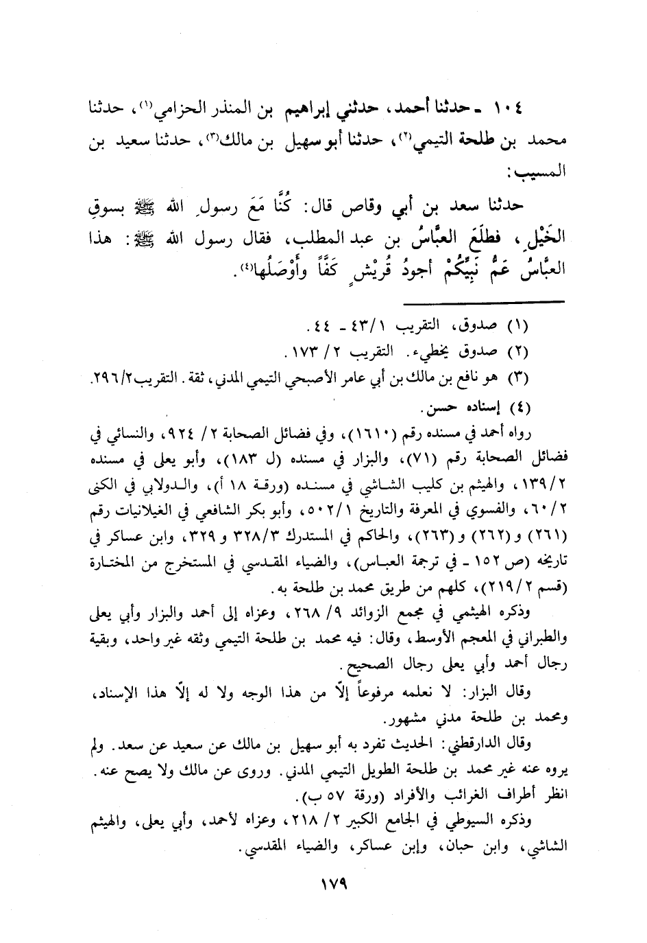 104 - حَدَّثَنَا أَحْمَدُ، حَدَّثَنِي إِبْرَاهِيمُ بْنُ الْمُنْذِرِ الْحِزَامِيُّ , حَدَّثَنَا مُحَمَّدُ بْنُ طَلْحَةَ التَّيْمِيُّ , حَدَّثَنَا أَبُو سُهَيْلِ بْنُ مَالِكٍ , حَدَّثَنَا سَعِيدُ بْنُ الْمُسَيِّبِ , حَدَّثَنَا سَعْدُ بْنُ أَبِي وَقَّاصٍ قَالَ: كُنَّا مَعَ رَسُولِ اللَّهِ صَلَّى اللهُ عَلَيْهِ وَسَلَّمَ بِسُوقِ الْخَيْلِ فَطَلَعَ الْعَبَّاسُ بْنُ عَبْدِ الْمُطَّلِبِ فَقَالَ رَسُولُ اللَّهِ صَلَّى اللهُ عَلَيْهِ وَسَلَّمَ: «§هَذَا الْعَبَّاسُ عَمُّ نَبِيِّكُمْ أَجْوَدُ قُرَيْشٍ كَفًّا وَأَوْصَلُهَا»