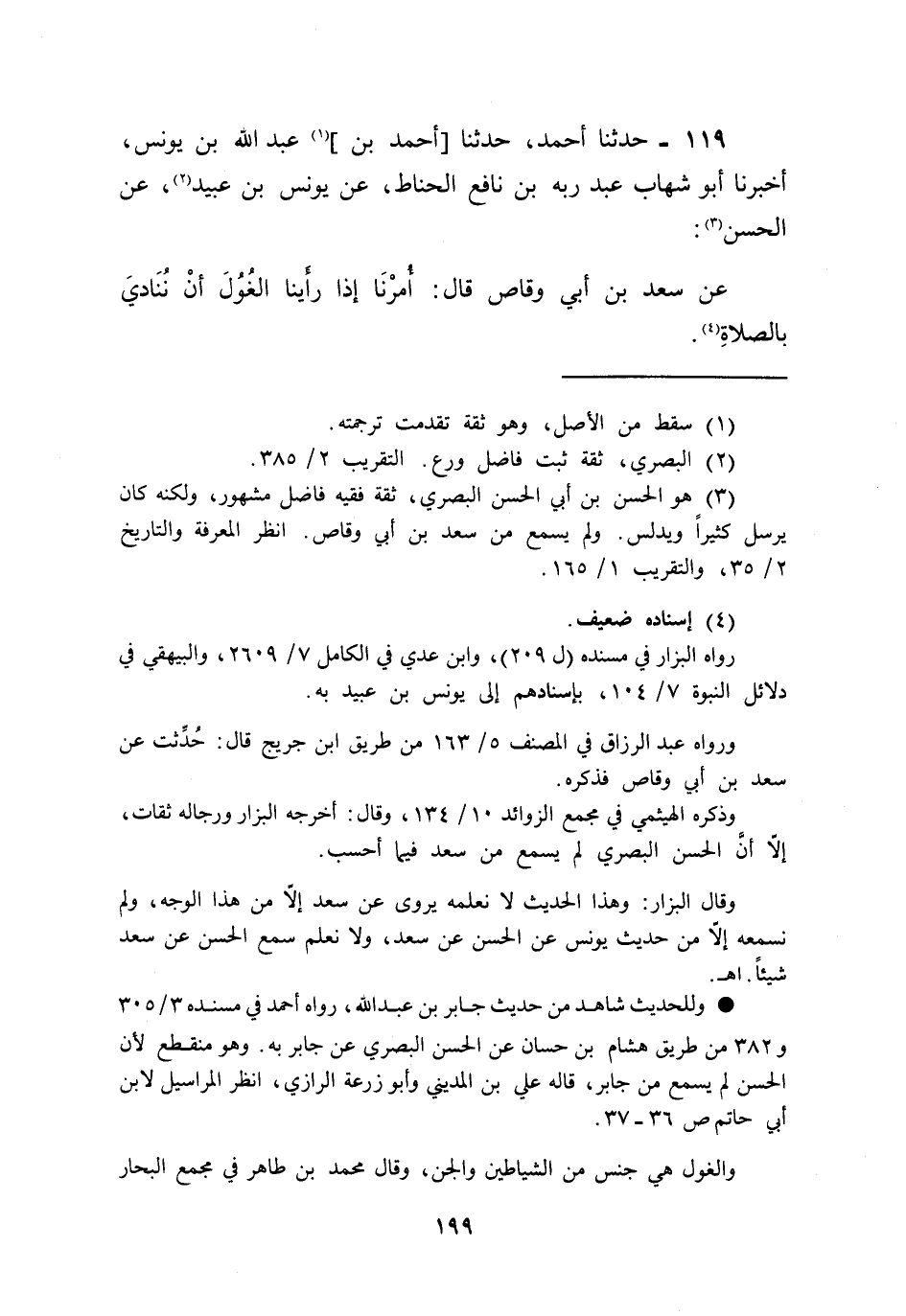 119 - حَدَّثَنَا أَحْمَدُ، حَدَّثَنَا أَحْمَدُ بْنُ عَبْدِ اللَّهِ بْنِ يُونُسَ , أَخْبَرَنَا أَبُو شِهَابٍ عَبْدُ رَبِّهِ بْنُ نَافِعٍ الْحَنَّاطُ , عَنْ يُونُسَ بْنِ عُبَيْدٍ , عَنِ الْحَسَنِ , عَنْ سَعْدِ بْنِ أَبِي وَقَّاصٍ قَالَ: «§أُمِرْنَا إِذَا رَأَيْنَا الْغُولَ أَنْ نُنَادِيَ بِالصَّلَاةِ»