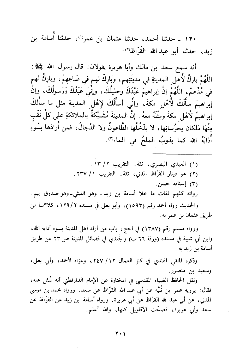 120 - حَدَّثَنَا أَحْمَدُ، حَدَّثَنَا عُثْمَانُ بْنُ عُمَرَ , حَدَّثَنَا أُسَامَةُ بْنُ زَيْدٍ , حَدَّثَنَا أَبُو عَبْدِ اللَّهِ الْقَرَّاظُ أَنَّهُ سَمِعَ سَعْدَ بْنَ مَالِكٍ , وَأَبَا هُرَيْرَةَ يَقُولَانِ: قَالَ رَسُولُ اللَّهِ صَلَّى اللهُ عَلَيْهِ وَسَلَّمَ: «§اللَّهُمَّ بَارِكْ لِأَهْلِ الْمَدِينَةِ فِي مَدِينَتِهِمْ، وَبَارِكْ لَهُمْ فِي صَاعِهِمْ، وَبَارِكْ لَهُمْ فِي مُدِّهِمُ، اللَّهُمَّ إِنَّ إِبْرَاهِيمَ عَبْدُكَ وَخَلِيلُكَ، وَإِنِّي عَبْدُكَ وَرَسُولُكَ، وَإِنَّ إِبْرَاهِيمَ سَأَلَكَ لِأَهْلِ مَكَّةَ، وَإِنِّي أَسْأَلُكَ لِأَهْلِ الْمَدِينَةِ، مِثْلَ مَا سَأَلَكَ إِبْرَاهِيمُ لِأَهْلِ مَكَّةَ وَمِثْلَهُ مَعَهُ، إِنَّ الْمَدِينَةَ مُشَبَّكَةٌ بِالْمَلَائِكَةِ عَلَى كُلِّ نَقْبٍ مِنْهَا مَلَكَانِ يَحْرُسَانِهَا، لَا يَدْخُلُهَا الطَّاعُونُ وَلَا الدَّجَّالُ، فَمَنْ أَرَادَهَا بِسُوءٍ أَذَابَهُ اللَّهُ كَمَا يَذُوبُ الْمِلْحُ فِي الْمَاءِ»