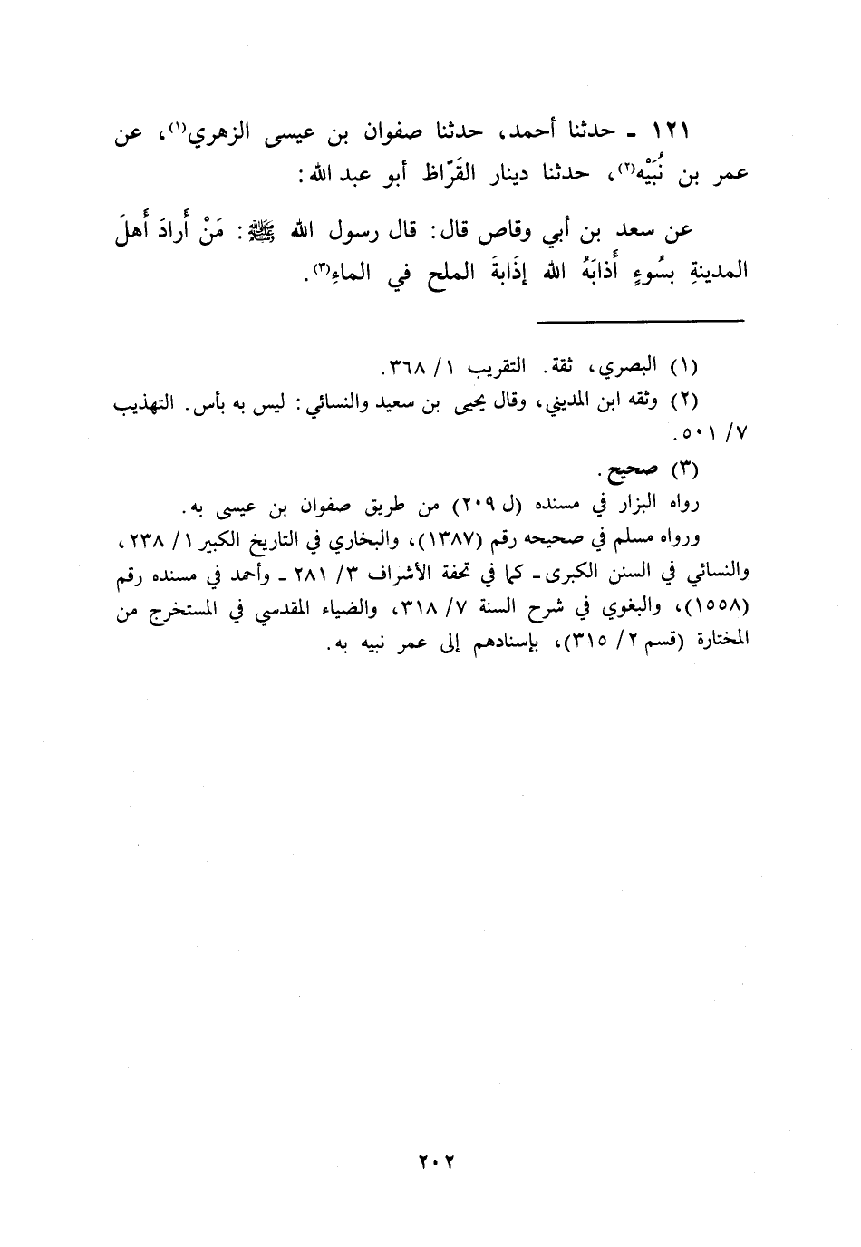 121 - حَدَّثَنَا أَحْمَدُ، حَدَّثَنَا صَفْوَانُ بْنُ عِيسَى الزُّهْرِيُّ , عَنْ عُمَرَ بْنِ نُبَيْهٍ , حَدَّثَنَا دِينَارٌ الْقَرَّاظُ أَبُو عَبْدِ اللَّهِ , عَنْ سَعْدِ بْنِ أَبِي وَقَّاصٍ قَالَ: قَالَ رَسُولُ اللَّهِ صَلَّى اللهُ عَلَيْهِ وَسَلَّمَ: «§مَنْ أَرَادَ أَهْلَ الْمَدِينَةِ بِسُوءٍ أَذَابَهُ اللَّهُ إِذَابَةَ الْمِلْحِ فِي الْمَاءِ»
