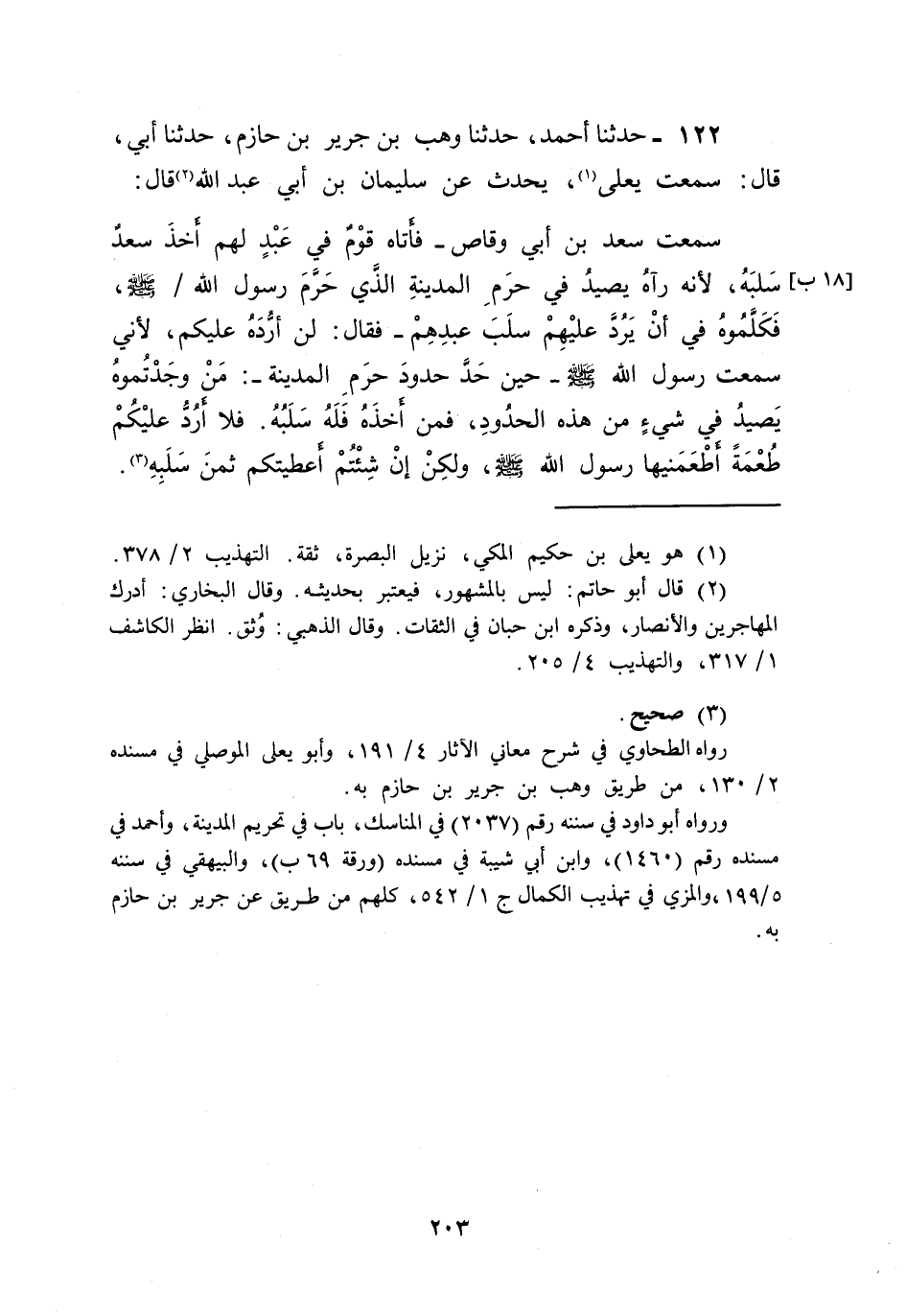 122 - حَدَّثَنَا حَدَّثَنَا أَحْمَدُ، وَهْبُ بْنُ جَرِيرِ بْنِ حَازِمٍ , حَدَّثَنَا أَبِي قَالَ: سَمِعْتُ يَعْلَى يُحَدِّثُ , عَنْ سُلَيْمَانَ بْنِ أَبِي عَبْدِ اللَّهِ قَالَ: سَمِعْتُ سَعْدَ بْنَ أَبِي وَقَّاصٍ - فَأَتَاهُ قَوْمٌ فِي عَبْدٍ لَهُمْ أَخَذَ سَعْدٌ سَلَبَهُ لِأَنَّهُ رَآهُ يَصِيدُ فِي حَرَمِ الْمَدِينَةِ الَّذِي حَرَّمَ رَسُولُ اللَّهِ صَلَّى اللهُ عَلَيْهِ وَسَلَّمَ فَكَلَّمُوهُ فِي أَنْ يَرُدَّ عَلَيْهِمْ سَلَبَ عَبْدِهِمْ - فَقَالَ: " §لَنْ أَرُدَّهُ عَلَيْكُمْ لِأَنِّي سَمِعْتُ رَسُولَ اللَّهِ صَلَّى اللهُ عَلَيْهِ وَسَلَّمَ - حِينَ حَدَّ حُدُودَ حَرَمِ الْمَدِينَةِ -: مَنْ وَجَدْتُمُوهُ يَصِيدُ فِي شَيْءٍ مِنْ هَذِهِ الْحُدُودِ فَمَنْ أَخَذَهُ فَلَهُ سَلَبُهُ فَلَا أَرُدُّ عَلَيْكُمْ طُعْمَةً أَطْعَمَنِيهَا رَسُولُ اللَّهِ صَلَّى اللهُ عَلَيْهِ وَسَلَّمَ وَلَكِنْ إِنْ شِئْتُمْ أَعْطَيْتُكُمْ ثَمَنَ سَلَبِهِ "